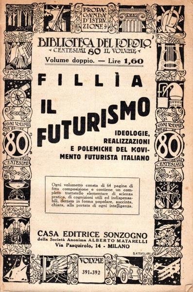 Il futurismo. Ideologie, realizzazioni e polemiche del movimento futurista italiano, prima edizione giugno 1932, pp. 125, formato 11 x 16,5.<BR>Copertina morbida illustrata. Biblioteca del Popolo. Volume doppio. <BR>Costola rovinata, ingiallimento delle pagine. Nel complesso buone condizioni.