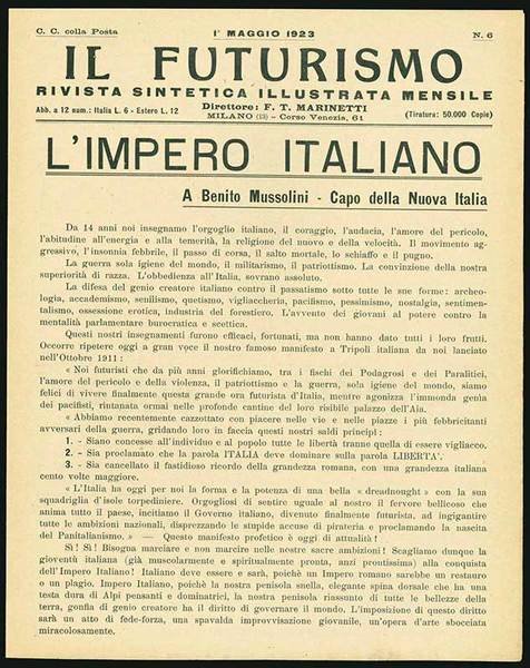 Il futurismo. Rivista sintetica illustrata mensile. N. 6: L’Impero italiano. A Benito Mussolini - Capo della Nuova Italia. [Segue:] L’Inegualismo