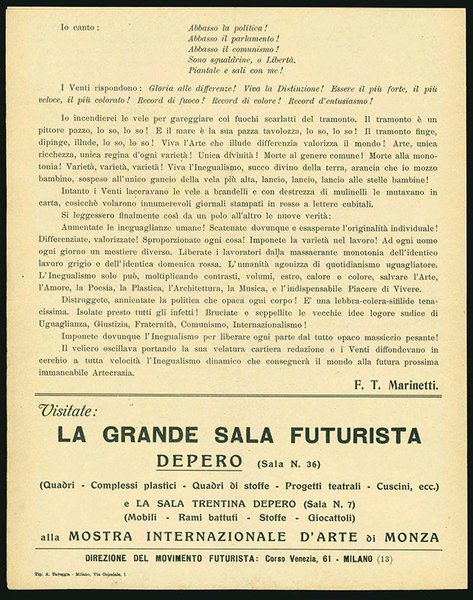 MANIFESTOPrima edizione, prima tiratura.Ottimo esemplare.Oltre alla «lettera aperta» al capo del fascismo (apparsa sull’«Impero» del 25 aprile 1923), nel foglio presente il manifesto «L'Inegualismo», a firma del solo Marinetti (uscito come «Ad ogni uomo, ogni giorno un mestiere diverso! Inegualismo e artecrazia» sul «Resto del Carlino» del 1° novembre 1922, quindi in francese su «Noi» n. 5, agosto 1923). In calce all’ultima pagina, reclame de «LA GRANDE SALA FUTURISTA | DEPERO | . e la Sala trentina Depero . alla Mostra internazionale d’arte di Monza», ovvero la Prima Biennale tenutasi dal 19 maggio al 31 ottobre 1923.Bibl.: Tonini, I manifesti del futurismo italiano, nn. 177 e 182 (non specifica la tiratura e registra solo la seconda)
