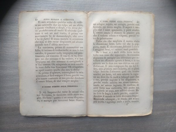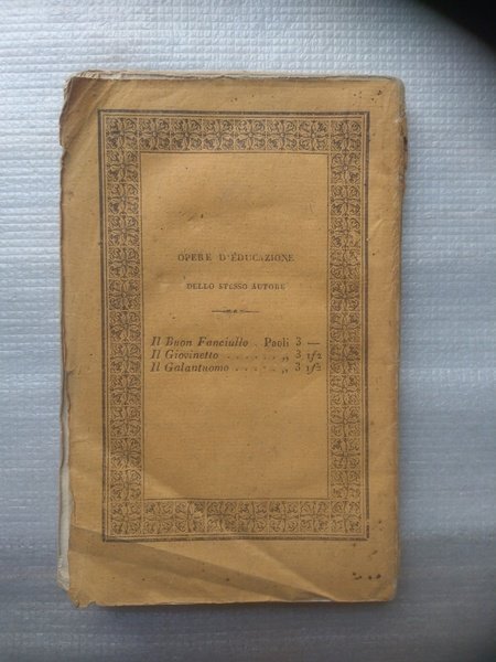 Decima edizione. Un volumetto (14 cm) di 164 pagine. Brossura cartacea originale, con titolo alla copertina, in cornice tipografica. Angoli delle prime pagine e della copertina arricciati. La prima edizione è del 1837, e l'opera che predicava le buone maniere alle nuove generazioni italiane ebbe un rapido successo.