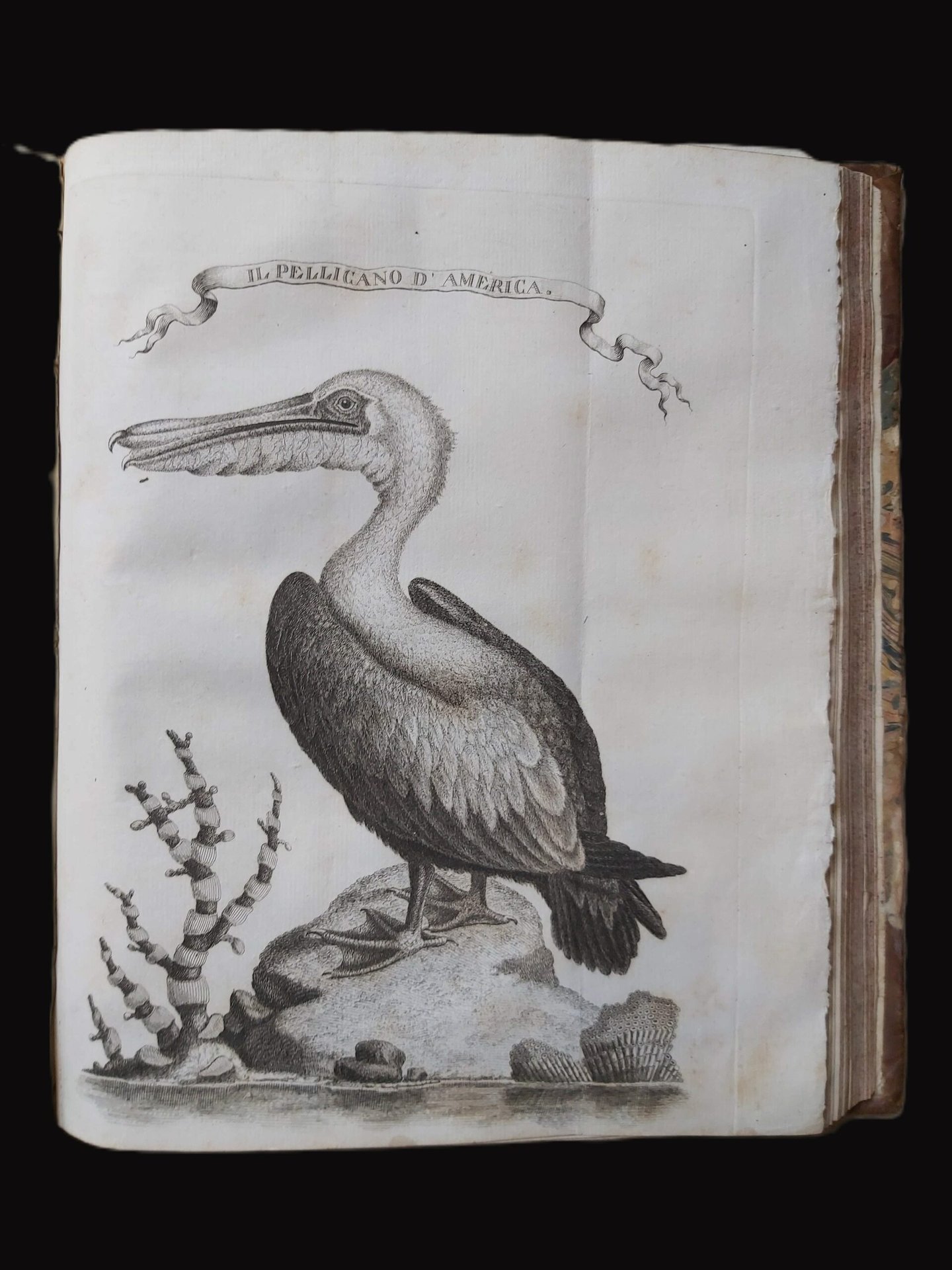 3 voll. in-4 (mm.292x237), leg. m. pelle coeva con tass. ai d., angoli, piatti in carta marmorizz. Tagli spruzzati. Antip. al primo vol. inc. in rame da F. Gregori su dis. di Carlo Coltellini raff. l'incontro tra Cristoforo Colombo e alcuni indigeni. Bella vignetta in rame inc. su ciascun front. Con 77 tavv. inc. in rame, spesso ripiegate, raffiguranti carte geografiche, piante topografiche, vedute, specie animali autoctone del Nuovo Mondo. Celebre opera in cui in fomra enciclopedica per voci si descrive il continente americano, con notizie storiche, geografiche e naturalistiche, e ampiamente illustrata da splendide tavole finemente incise. Segnaliamo in particolare le vedute a volo d'uccello e piante topografiche di Boston, New York, Santiago, Lima, Cuba, Martinica, Barbados, Florida, etc. Altre rappresentazioni riguardano animali come aironi, colibrì, tucani, castori, armadillo, opossum, pinguini, pellicano. E rilievo viene dato anche alle manifatture con scene di coltivazione del tabacco, canna da zucchero, piantagioni, cotone, manioca. Prima edizione italiana sulla inglese dell'anno precedente che comprendeva però solo 8 incisioni. La presente copia contiene una lunga nota manoscritta sulla prima carta bianca con dedica ex dono del Cav. Filippo Saluzzo dei Duchi di Corigliano al Sig. Clemente Pace datata 1828. Timbretto araldico ai front. Qualche lieve brunitura marginale, riparazione di integrazione alle cuffie, ottimo e marginoso esempl. [708]