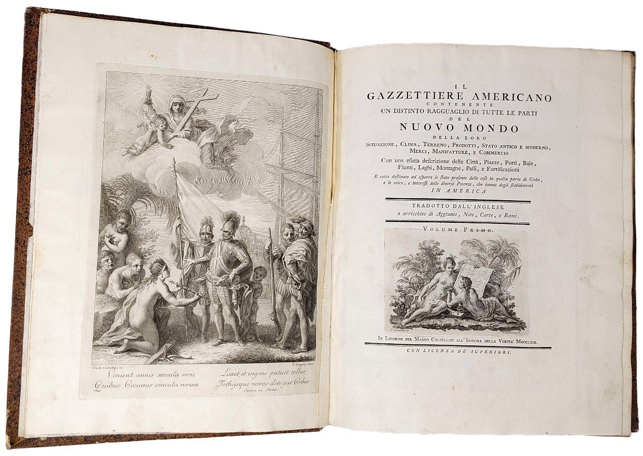 Il Gazzettiere Americano (vol. I e II, su tre), contenente un distinto ragguaglio di tutte le pòarti del Nuovo Mondo, della loro situazione, clima, terreno, prodotti, merci, manifatture e commercio con esatta descrizione delle città, piazze, porti, baje, fiumi. Il tutto destinato ad esporre lo stato presente delle cose in quella parte del Globo...in America.