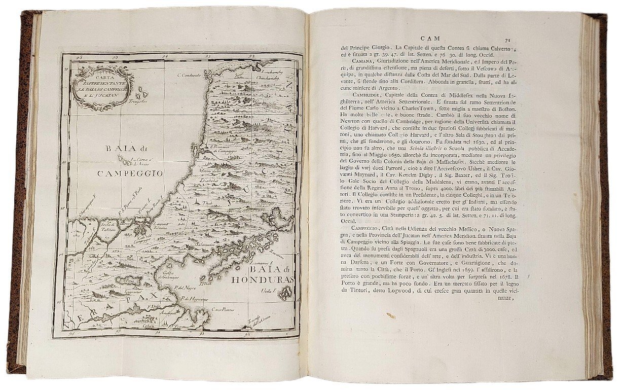 >2 vol. in-4 (primo e secondo, manca il terzo), pp. XXIII, 216, 256. 1 f. in fine dei 2 vol. per l'Indice dei rami. Cartonato coevo, titolo in oro su tassello al dorso. Al vol. primo finissimo antiporta raffigurante l'incontro di Colombo con gli Indigeni. Vignette, finalini e 54 incisioni f.testo (su 78 dei tre volumi: 31 nel primo, 23 nel II) molte ripiegate (carte geogr., vedute, costumi, riti degli indigeni, fauna e flora). Pubblicazione di fondamentale importanza per la conoscenza di storia naturale, economia e sociologia del continente americano: ogni località viene accuratamente descritta in ordine alfabetico. Le incisioni, per lo più opera di V. Vanni, V. Rossi, A. Scacciati e G.M. Terreni, sono anche molto decorative. Unica edizione, che traduce un volume anonimo pubblicato a Londra l'anno precedente, privo di tavole. Bellissimo esemplare, fresco e ad ampi margini.  Sabin 26814. Leclerc 233. J.Carter Brown, Italians and creation of America 81: «The printer has elevated the cramped, unattractive English original into a handsome book, and the visual effect of the Italian edition is strikingly superior.. there is much more information about the English colonies in America than is found in most geographical books written by continental authors up to this time» .