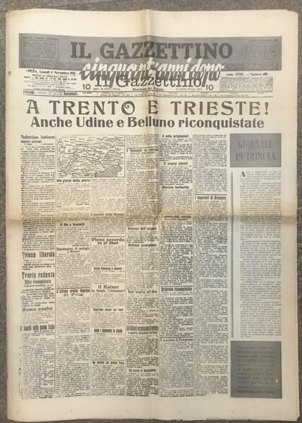Ristampa anastatica de Il Gazzettino di Lunedi 4 novembre 1918. Molto buono, formato giornale, xvi pp, ill. bn, ingialliture, strappetti marginali. Stampa 4 novembre 1968