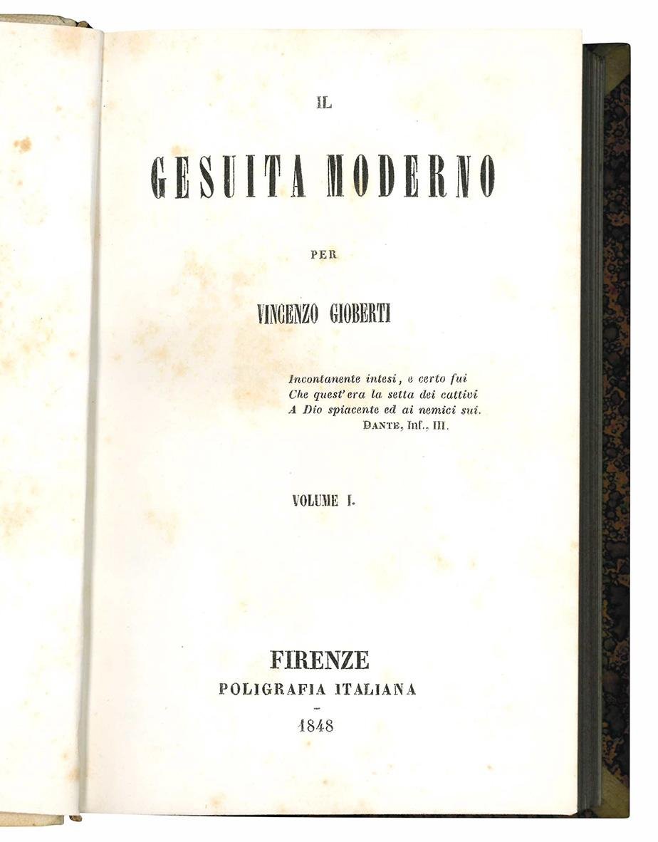 Ciqnue volumi in 8vo (mm 173x110); pp. 423, [1]; 536; 536; 538, [2]; 449, [3]. Occhietto. Lievi fioriture ad alcune carte. Mezza pergamena posteriore, piatti rivestiti con carta colorata. Dorso con titolo e numero del volume su doppio tassello, piccoli fregi e filetti in oro. Fa parte della collana "Opere di Vincenzo Gioberti".