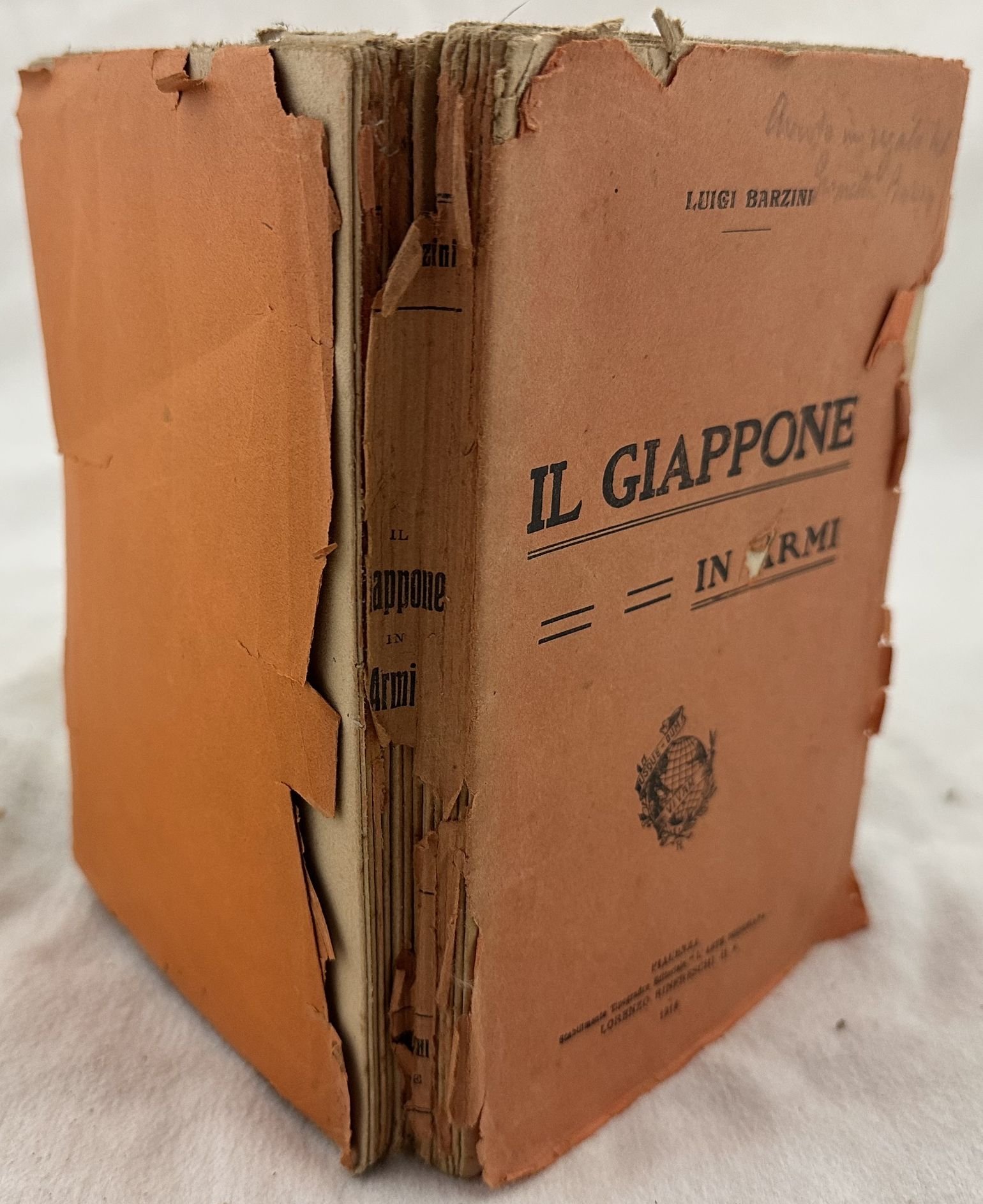 Edizione del 1916 di questa opera sulla guerra russo giapponese degli anni 1904-1905 scritto da Luigi Barzini (1874-1947). In discrete condizioni. Copertina editoriale in discrete condizioni generali con usure ai margini e dorso; piatto posteriore staccato. Legatura in mediocri condizioni con rotture. All'interno le pagine si presentano in ottime condizioni con rare fioriture. In 8. cm 19,5x13. Pp. 230+(2)Edition of 1916 of this war about the russo japanese war of the years 1904-1905 written by Luigi Barzini (1874-1947). In fair conditions. Editorial cover in fair conditions with worn edges and spine; back plate is detached. Binding in poor conditions with cracks. Inside pages are in very good conditions with occasional foxings.In 8. cm 19,5x13. Pp. 230+(2)