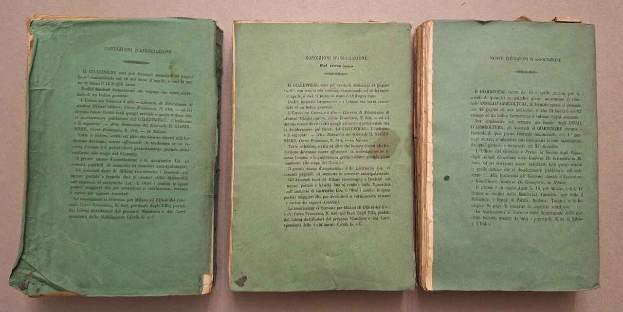 IL GIARDINIERE GIORNALE D'ORTICOLTURA TEORICA E PRATICA A.UBICINI 1852-1853-1854In 8°, 3 volumi, brossura editoriale, tavole a colori in cromolito..Lievi segni alle copertine, pagine fresche e pulite.Ulteriori dettagli e immagini a richiesta.