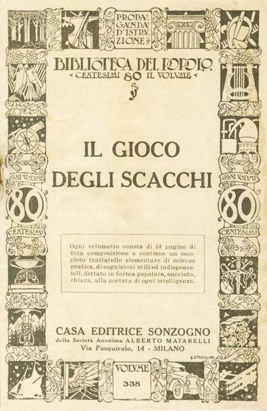 In-16 p. (mm. 162x106), bross. orig. figur., pp. 60(2). Completo trattatello del gioco degli scacchi dettato in forma popolare, chiara, succinta, alla portata di ogni intelligenza. Parte prima "I principi generali": movimento dei pezzi - notazione - vocaboli più usati - valore dei pezzi - leggi del gioco - 40 brevi partite - Parte seconda "Teoria del gioco": apertura - mezzo della partita - partita francese - il finale. Ben conservato.