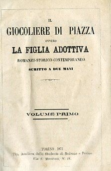 4 parti in 3 voll. in un tomo in-8° piccolo, pp. (2), 125, (3), 116; (2), 360, (2); (2), 108, (2); legatura del tempo m. percallina verde. Titolo in oro al dorso, punte in pergamena. Testo entro doppio filetto. Bell'esemplare. Prima e unica edizione, rara, di anonimo romanzo storico il cui protagonista, su uno sfondo risorgimentale, è il giocoliere di piazza Giuseppe Amisani. Nell'opera vengono introdotti come personaggi anche Rosmini e Gioberti. Fra le località che fanno da cornice alla narrazione: Recoaro, Terni, Roma, Nizza Marittima, Borgo Masino, Asti, il Castello di Cortanze, Moncalvo, Frinco, Torino, Domodossola. L'autore del romanzo non è mai stato identificato.