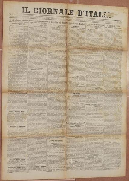 In folio. Dim. 58x43 cm. Pp. 4. Numero del 19 febbraio 1903 di questo raro quotidiano fondato a Roma nel 1901 e chiuso nel 1973. All'interno: Intervista con l'ambasciatore Montebello, Insuccessi della Francia in Etiopia, Delcasse sulla Macedonia, La malattia di Teresa Humbert, Preparativi militari in Turchia, Torri, campanili e teste vacillanti (San Marco), pubblicità d'epoca In buone condizioni. Raro. Brossura editoriale in buone condizioni generali con lievi usure ai margini e dorso. Piegature. All'interno le pagine si presentano in buone condizioni con rare fioriture. Piegature. Difetti di stampa alla pagina 2 con perdita di testo. Number of the 19th of february 1903 of this scarce daily newspaper established in Rome in 1901 and closed in 1973. Inside: Interview with Ambassador Montebello, Unucces of france in Aethiopia, Delcasse in Macedonia, Desease of Teresa Humbert, Military preparation in Turkey, Falling towers and heads (San Marco), advertisings. In good conditions. Scarce copy Editorial cover in good general conditions slightly worn in the edges and spine. Foldings. Inside pages are in good conditions with occasional foxings. Printing defeats in page 2 with loss of text.