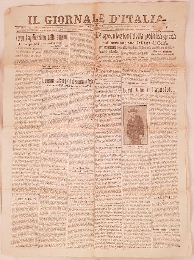 In folio. Dim. 58x42 cm. Pp. 6. Numero del 12 settembre 1923 di questo raro quotidiano fondato a Roma nel 1901 e chiuso nel 1973. All'interno: Verso l'applicazione delle sanzioni, le speculazioni della politica greca sull'occupazione italiana di Corfu, L'amarezza italiana per l'atteggiamento inglese, Le speculazioni della politica greca sull'occupazione italiana di Corfu, Per l'indipendenza irlandese, Il terremoto nel Giappone, Il codice aldino del Petrarca e il Testamento di Filippo Strozzi rinvenuti in Sicilia, La Germania preoccupata e nervosa, Da Corfu a Fiume, pubblicità d'epoca.<BR>In buone condizioni. Raro. Brossura editoriale in buone condizioni generali con lievi usure ai margini e dorso. Piegature. All'interno le pagine si presentano in buone condizioni con rare fioriture. Piegature. Numerose parti mancanti ai margini con perdita di testo. Number of the 12th of september 1923 of this scarce daily newspaper established in Rome in 1901 and closed in 1973.<BR>Inside: Towards application of taxes, greek policy about italian occupation of Corfu, Irish independence, Earthquake in Japan, The codice aldino of Petrarca andTestamento of Filippo Strozzi found in Sicily, Germany is worried and nervous, From Corfu to Fiume, advertisings.<BR>In good conditions. Scarce copy Editorial cover in good general conditions slightly worn in the edges and spine. Foldings. Inside pages are in good conditions with occasional foxings. Foldings. Tears. Different missing parts in the edges with loss of text.