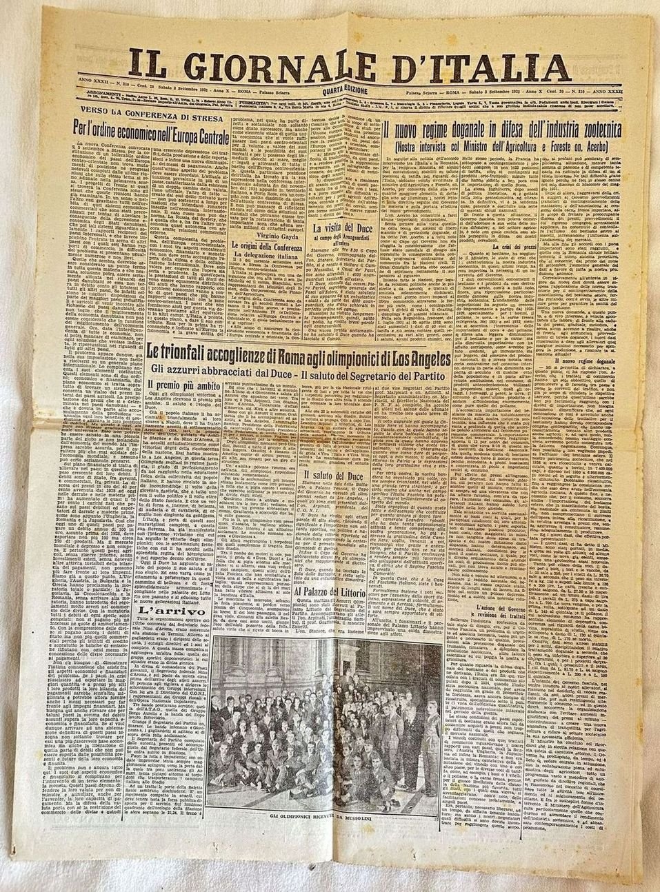 Numero del 3 settembre 1932 di questo raro quotidiano fondato a Roma nel 1901 e chiuso nel 1973.<BR>All'interno: Verso la Conferenza di Stresa, Le trionfali accoglienze di Roma agli olimpionici di Los Angeles, Il nuovo regime doganale in difesa dell'industria zootecnica, La popolazione delle colonie italiane il primo risultato del censimento, L'On. Augusto Turati ricoverato, Sciagura aviatoria a Montecelio, Il rinnovamento sociale ed edilizio di Varese, Su le orme di Anita in Terra Brasiliana, <BR>Il Duce asiste al saggio ginnico corale in Piazza di Siena, Il "Campo del Dux" è cominciato ai Parioli, Un giornalista francese dell'Africa Equatoriale, Il monumento ai caduti di Trasacco, Tragedia di Morsiconovo, Viva in attesa in Abruzzo per la Coppa Gran Sasso d'Italia; Il popolo albanese festeggia il quarto anniversario della proclamazione della Monarchia ecc.<BR>In buone condizioni. Raro. Brossura editoriale in buone condizioni generali con lievi usure ai margini e dorso. Piegature. All'interno le pagine si presentano in buone condizioni con rare fioriture. Piegature. In folio. Dim. 58,5x42 cm. Pp. 8.Number of the 3rd of september 1932 of this scarce daily newspaper established in Rome in 1901 and closed in 1973. Inside: Verso la Conferenza di Stresa, Le trionfali accoglienze di Roma agli olimpionici di Los Angeles, Il nuovo regime doganale in difesa dell'industria zootecnica, La popolazione delle colonie italiane il primo risultato del censimento, L'On. Augusto Turati ricoverato, Sciagura aviatoria a Montecelio, Il rinnovamento sociale ed edilizio di Varese, Su le orme di Anita in Terra Brasiliana, <BR>Il Duce asiste al saggio ginnico corale in Piazza di Siena, Il "Campo del Dux" è cominciato ai Parioli, Un giornalista francese dell'Africa Equatoriale, Il monumento ai caduti di Trasacco, Tragedia di Morsiconovo, Viva in attesa in Abruzzo per la Coppa Gran Sasso d'Italia; Il popolo albanese festeggia il quarto anniversario della proclamazione della Monarchia etc.<BR>In good conditions. Scarce copy Editorial cover in good general conditions slightly worn in the edges and spine. Foldings. Inside pages are in good conditions with occasional foxings. Foldings. In folio. Dim. 58,5x42 cm. Pp. 8.