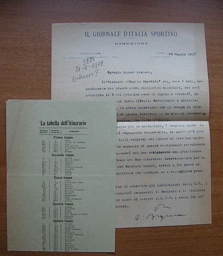 (cm ), , pagg. Lettera originale dattiloscritta su carta intestata di cm 27x20, timbro ad inschiostro del Comune di Ascoli Piceno, firma autografa del Direttore A. Bergamini. Alla lettera ? originariamente acclusa (come si legge nel testo): La tabella dell'itinerario. Foglio originale di cm 38x14 ca. con il calendario delle dieci tappe (completo di distanze parziali, distanze progressive, citt? di partenza, arrivo e passaggio) della gara ciclistica nazionale organizzata dal "Giornale d'Italia Sportivo". Rarissima ed interessante lettera in cui il Direttore Bergamini (San Giovanni in Persiceto, 1871 - Roma, 1962) annuncia che il "Giornale Sportivo d'Italia" sta "organizzando una grande prova ciclistica nazionale, che avr? principio il 2 luglio 1919 e toccher? in dieci tappe quasi tutta l'Italia Meridionale e Centrale" e chiede al Sindaco di Ascoli Piceno di interessarsi "per la organizzazione dei Comitati locali".
