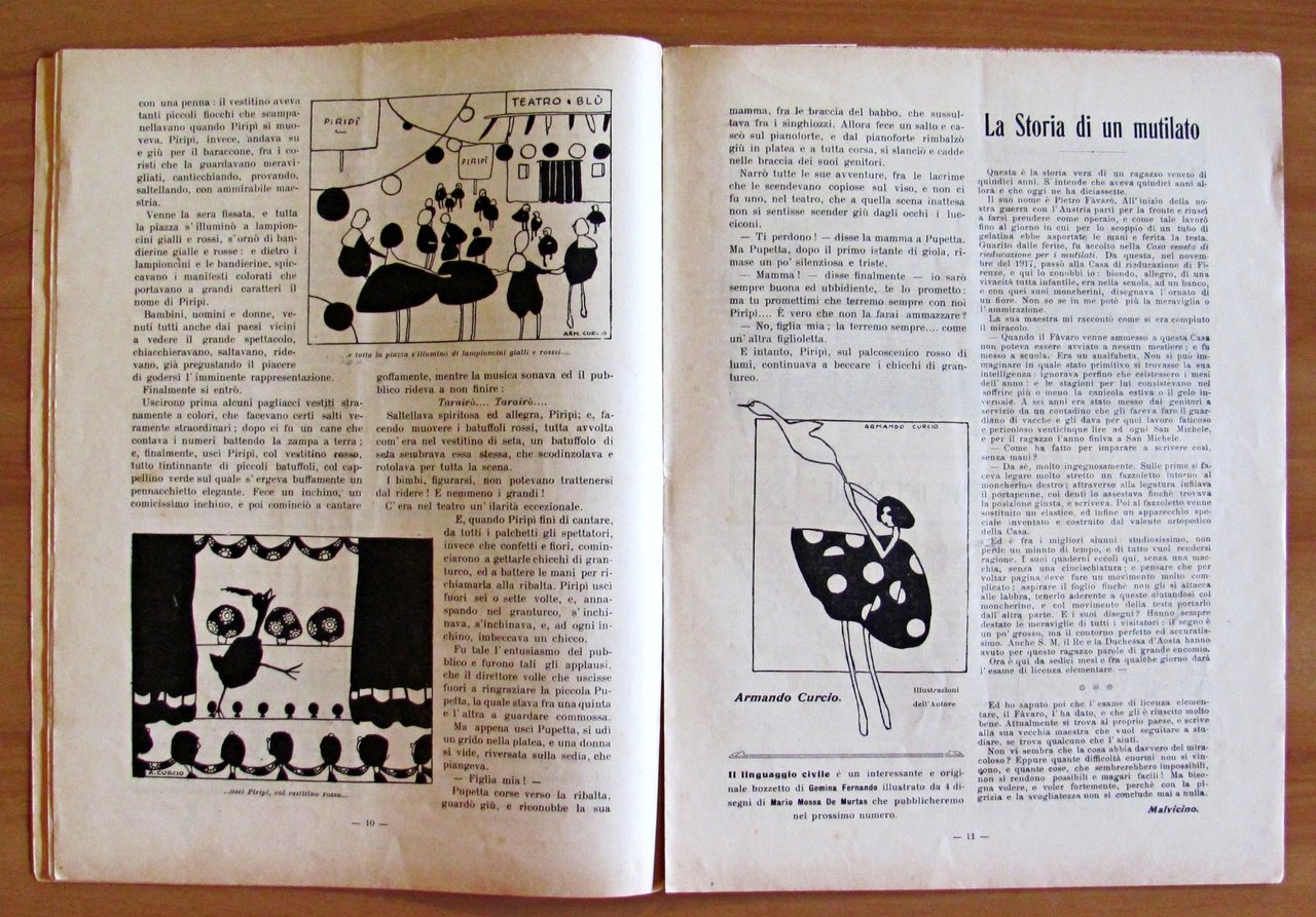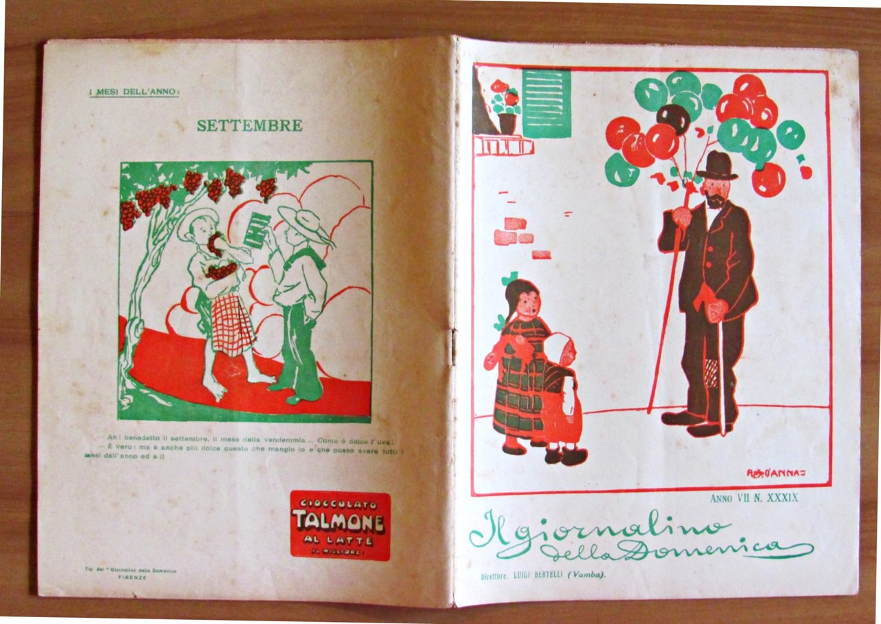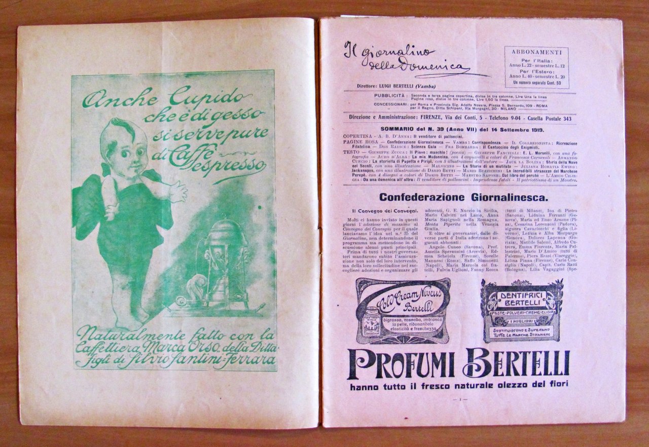 Rivista settimanale. Anno VII - N.XXXIX. Firenze, 14 Settembre 1919. Illustrazioni, di cui alcune fotografiche, in b/n e a colori n.t. Direttore Luigi Bertelli (Vamba) - Firenze, 1919. Brossura editoriale con piccola mancanza e taglietti alla retrocopertina e imperfezioni al margine basso del dorso. Lievi fioriture del tempo alle copertine. 21,5x28,5; pp.24 + XVI. BUONISSIMO STATO , Molto buono (Very Good)