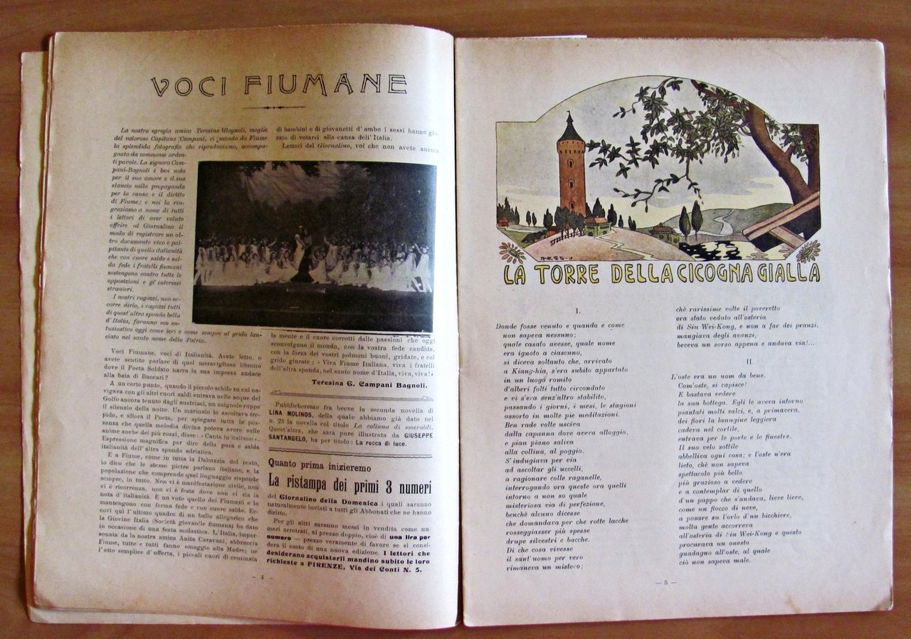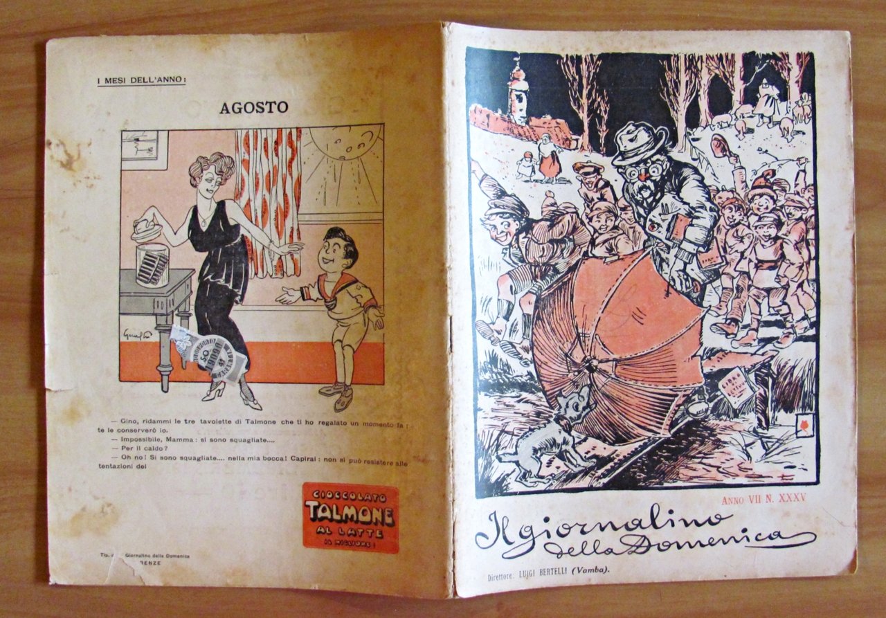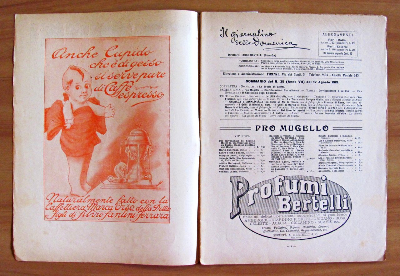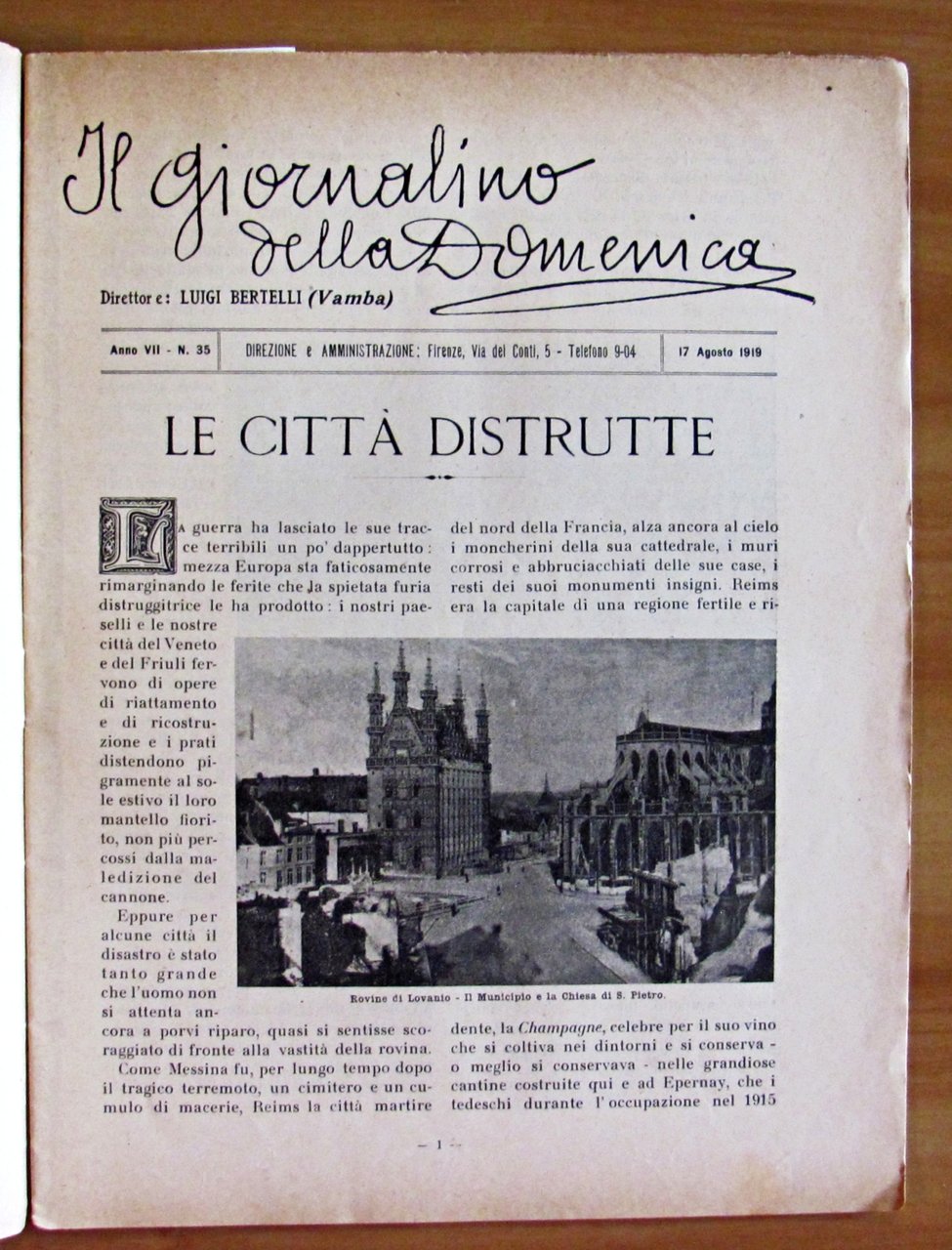 Rivista settimanale. Anno VII - N.XXXV. Firenze, 17 Agosto 1919. Illustrazioni, anche fotografiche, in b/n e a colori n.t. Capuana, Città distrutte dalla guerra, Fiume... Direttore Luigi Bertelli (Vamba) - Firenze, 1919. Brossura editoriale con piccola mancanza e taglietti alla retrocopertina. Imperfezioni del tempo al margine basso del dorso. Lievi alle copertine. 21,5x28,5; pp.24 + XVI. BUONISSIMO STATO , Molto buono (Very Good)
