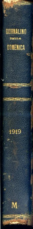 Raccolta dei numeri pubblicati fra 13 luglio 1919 e il 21 dicembre 1919 (dal n. 30 al n. 53 dell'anno settimo) di questo celebre periodico per l'infanzia fondato e diretto da Vamba. In-8° grande (270x205mm), tra le 24 e le 32 pp. ca. per ciascun numero + svariate pp. in ciascun fascicolo in numerazione romana ed impresse su carta rosa. Legatura coeva m. pelle verde cupo con titolo e greche in oro al dorso. Sguardie decorate. Numerosissime illustrazioni a colori o in b.n. n.t. di artisti come Argo, Bea, Dario Betti, Toppi, Santangelo, Filiberto Scarpelli, Anichini, ecc. Numerose pubblicità figurate. Piccoli restauri a cuffie e cerniere. Copertine editoriali non conservate. Bell'esemplare. Nato il 24 giugno 1906 a Firenze presso la Bemporad e diretto da Luigi Bertelli (Vamba), il 'Giornalino della Domenica' può essere considerato il primo periodico moderno per l'infanzia. Organo della propaganda irredentista e mazziniana, oltre che foglio destinato alla giovinezza, tra gli autori dei suoi testi figurarono nomi come Pascoli, De Amicis, la Deledda, Fucini, Salgari, Capuana, Ojetti, René Bazin, Alfredo Baccelli, Omero Redi (Ermenegildo Pistelli), Sergio Tofano, Milly Dandolo, Jack La Bolina, Piero Calamandrei, Alberto Viviani, Mario Buzzichini, Giuseppe Fanciulli, ecc. Cessò le pubblicazioni nel 1927. Esso 'per ricchezza e varietà delle rubriche, per la nobiltà degli intenti, patriottici ed educativi, offuscò la fama di tutti i periodici del genere', scrive Amedeo Guglielmelli in Autori per l'infanzia, Rovigo, 1954, p. 227.