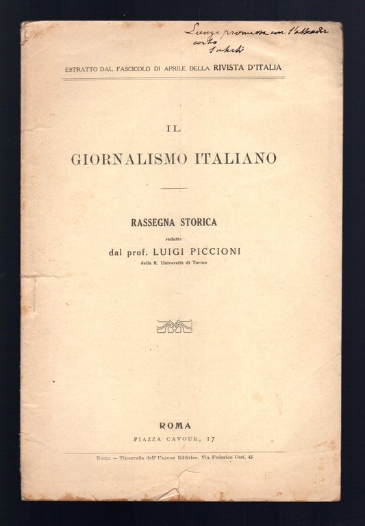 Opuscolo vintage. Estratto dal fascicolo di aprile della Rivista d'Italia. Dedica autografa dell'autore. Bordi usurati, pagina interna con strappo. Piega centrale. Evidente segno del tempo.