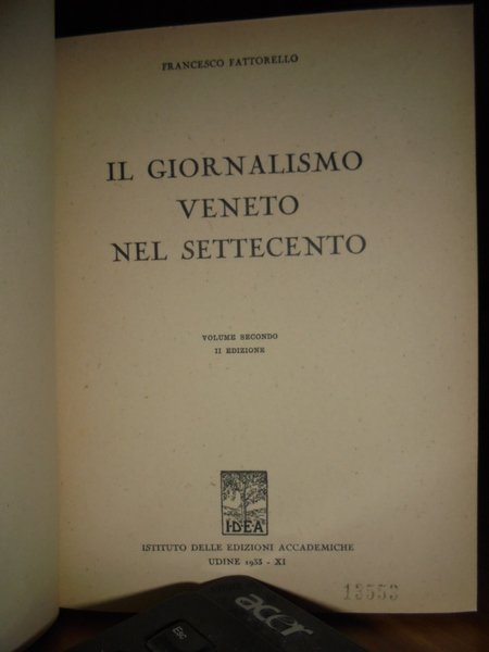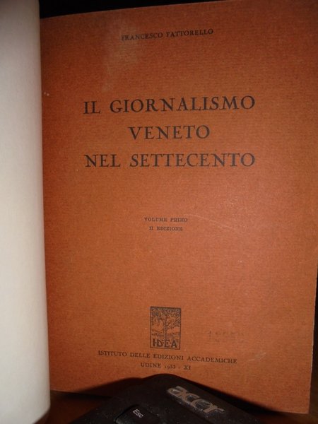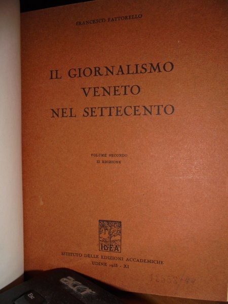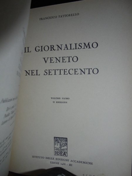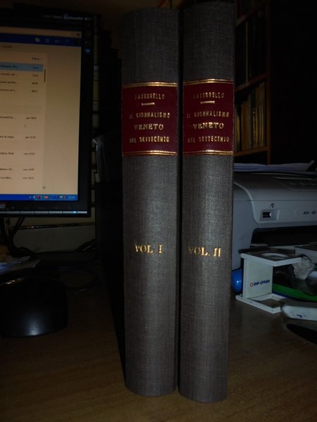 Francesco, Fattorello. Udine, IDEA, Istituto delle Edizioni Accademiche, 1933. Il Giornalismo Veneto nel Settecento. Seconda edizione. 2 volumi in-8°, tela con titoli in oro entro tasselli ai dorsi, le copertine originali sono conservate. vii, 378 pp. complessive. Come nuovi. Neg. nat. mob. 0