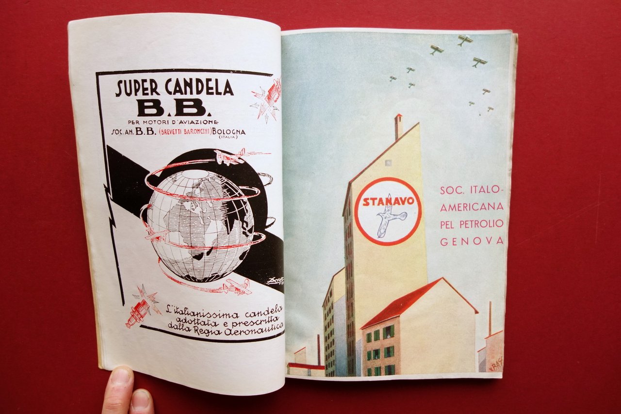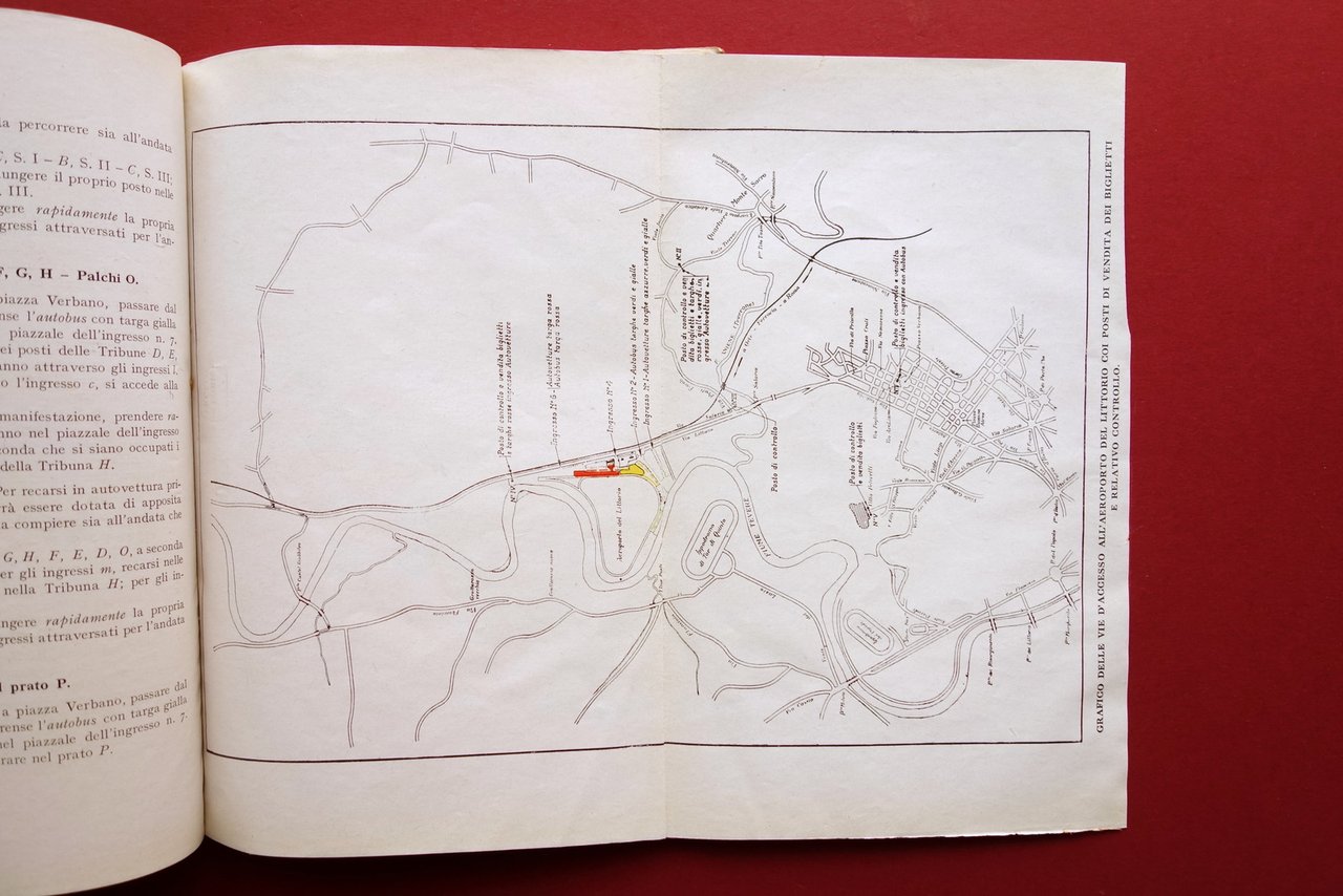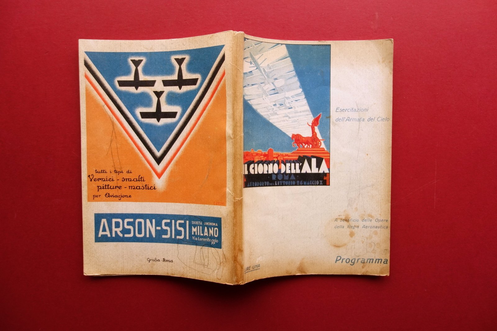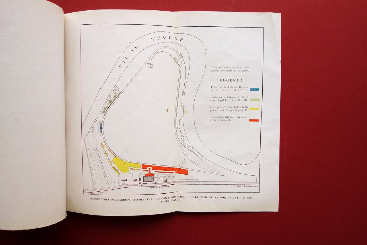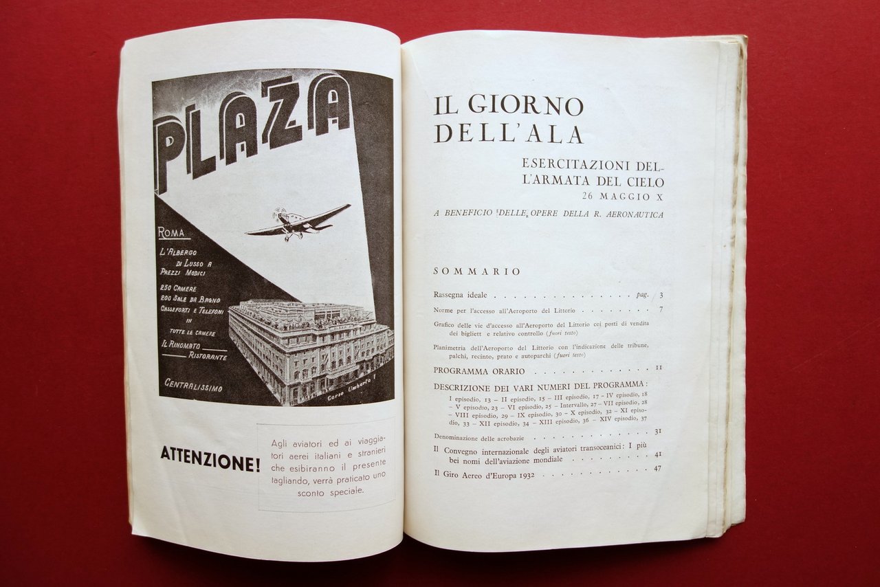 Libretto - programma, Il giorno dell'Ala Roma - Aeroporto del Littorio 26 maggio 1932 esercitazioni dell'Armata del Cielo a beneficio delle opere della Regia Aeronautica Programma Roma, 1932; cm 24x16,5; pp. [112]-50, con numerose ill. in b/n nel t. più due tavv. rip. in b/n con dettagli a colori; le pagine senza numerazione sono tutte inserzioni pubblicitarie d'epoca in b/n e a colori, varie con alta qualità grafica. Cartoncino ed. con bella grafica d'epoca a colori. Condizioni di conservazione Esemplare in buone condizioni con tracce d'uso, cartoncino ed. leggermente ingiallito ai margini e al dorso, con qualche piccolo alone e poche vecchie annotazioni a matita di mano infantile (vedi foto). Interni buoni; qualcuna delle inserzioni pubblicitarie al termine del testo staccata dalla legatura, esemplare peraltro compatto. Raro, riccamente illustrato e con due tavole ripiegate fuori testo (vedi foto). Numerosissime inserzioni pubblicitarie d'epoca, sia in bianco e nero che a colori. SETT130.L22409 N