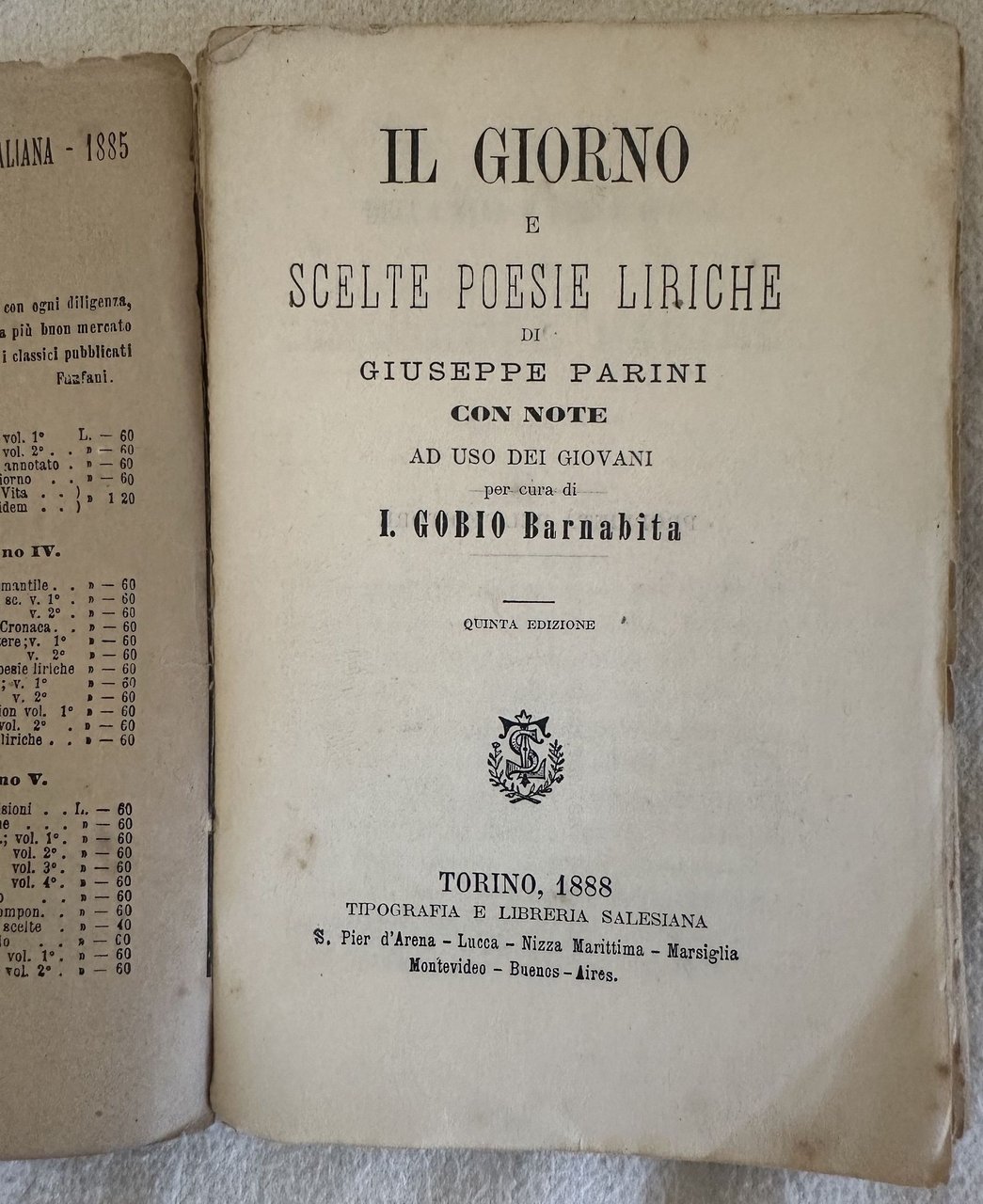 IL GIORNO E SCELTE POESIE LIRICHE DI GIUSEPPE PARINI CON NOTE AD USO DEI GIOVANI PER CURA DI I. GOBIO BARNABITA