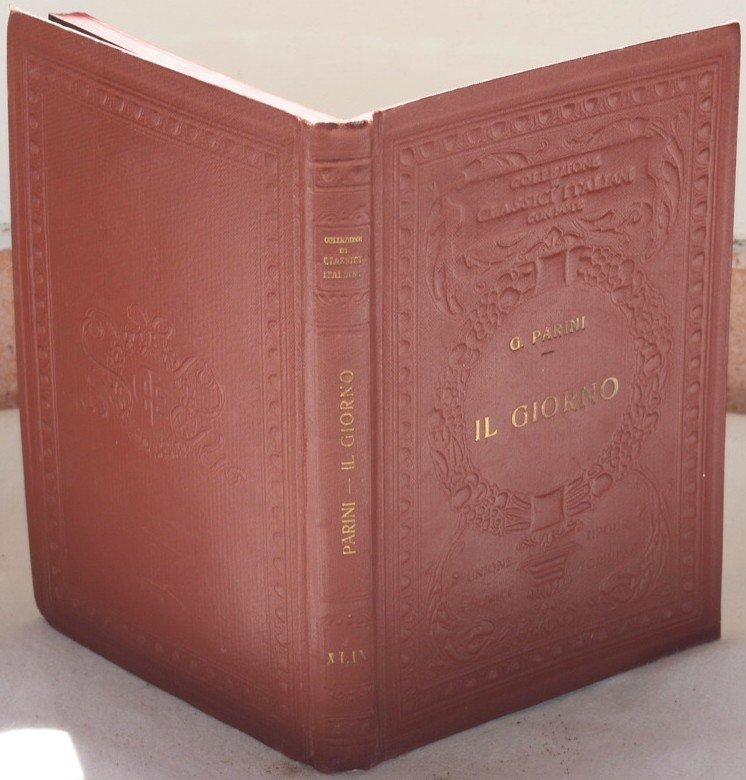In 16. Dim. 18,5x12,5 cm. Pp. XXXVIII+169+(5). Edizione del 1927 della serie "Collezione di classici italiani con note" di questa opera di Giuseppe Parini (1729-1799) poeta, librettista e traduttore italiano. Parini è uno dei massimi esponenti del Neoclassicismo e dell'Illuminismo italiano. Introduzione e note di Giulio Dolci. All'interno sono presenti due planches fotografiche. Bella brossura editoriale in tela decorata. In buone condizioni. Brossura editoriale in tela con decorazioni in oro ed a secco ai piatti in ottime condizioni generali con lievi usure ai margini e dorso. Legatura in buone condizioni. All'interno le pagine si presentano in ottime condizioni con rare fioriture. Edition of 1927 of the series "Collezione di classici italiani con note" of this work by Giuseppe Parini (1729-1799) italian poet, booklet writer and translator. Parini is one of the most importante exponents of the italian Neoclassicism and Illuminism. Introduction and notes by Giulio Dolci. Inside there are two planches. Beautiful editorial decorated cover. In very good conditions. Cloth editorial cover with golden and embossed decorations in the plates in very good general conditions slightly worn in the edges and spine. Binding in good conditions. Inside pages are in very good conditions with occasional foxings.