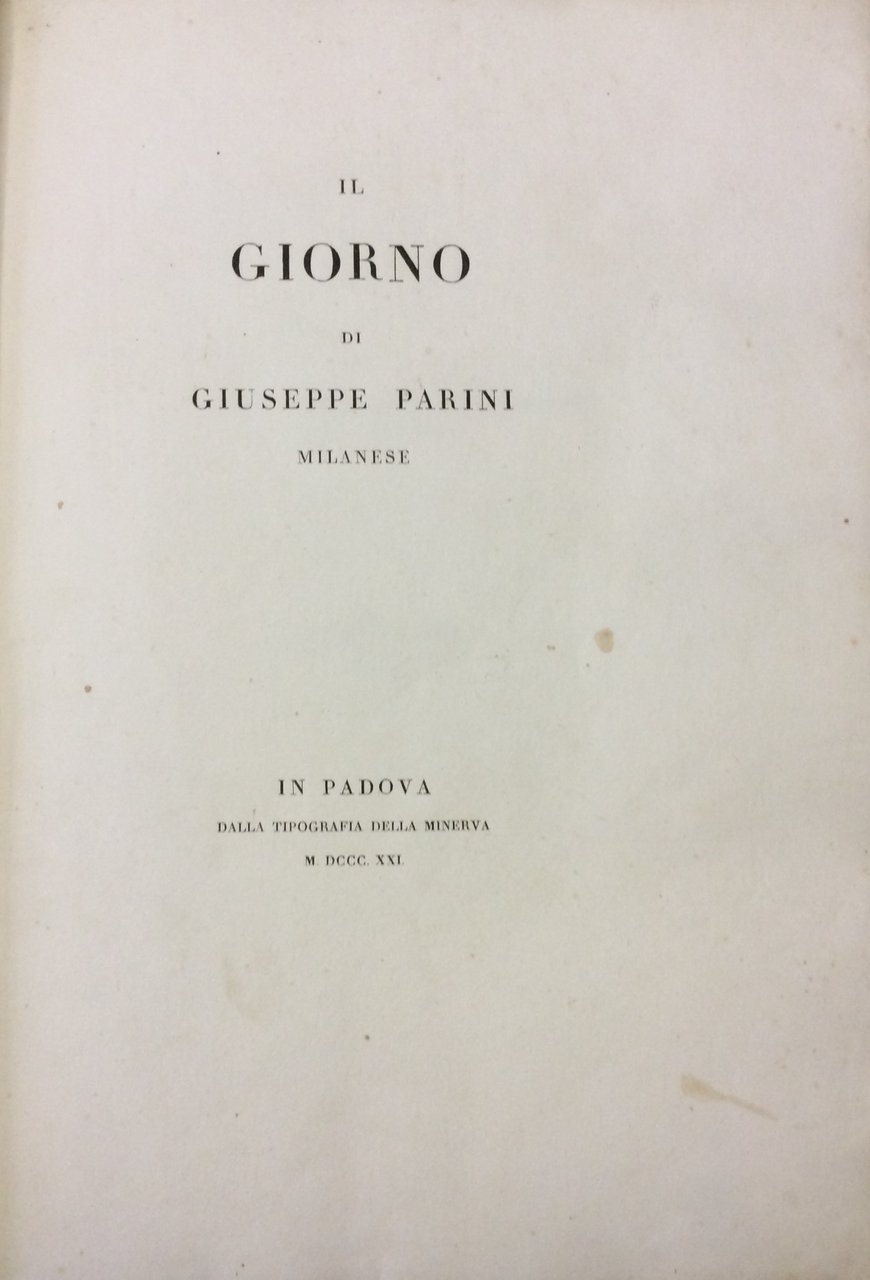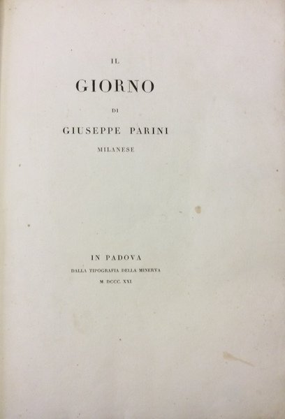 In-4 p. (mm. 296x206), cartoncino muto ottocentesco (risg. rifatti), tit. ms. al dorso, pp. (8),133,(3), con i poemetti Il Mattino - Il Meriggio - Il Vespro - La Notte. Cfr. Bustico Bibl. di Giuseppe Parini,66, p. 20 che cita le numer. ediz. col titolo Il Giorno, a partire dalla prima del Mussi, Parma, 1805. Bella edizione di sole 138 copie numerate, tutte in carta velina. Il ns., 50, con fiorit. solo su alc. cc., altrimenti esemplare con barbe, ben conservato.