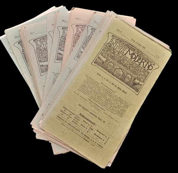 Il Giovane Artista Moderno. Anno I. 1902 annata completa a parte il numero 1 qui assente, per un totale di 23 numeri (il numero 17 e 18 sono uniti in un unico numero) e 5 numeri del 1903 dal primo al sesto, escluso il numero 4 mancante.