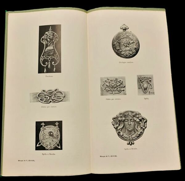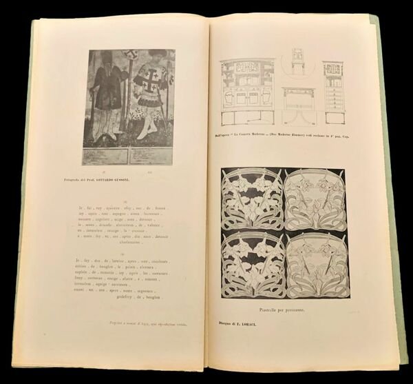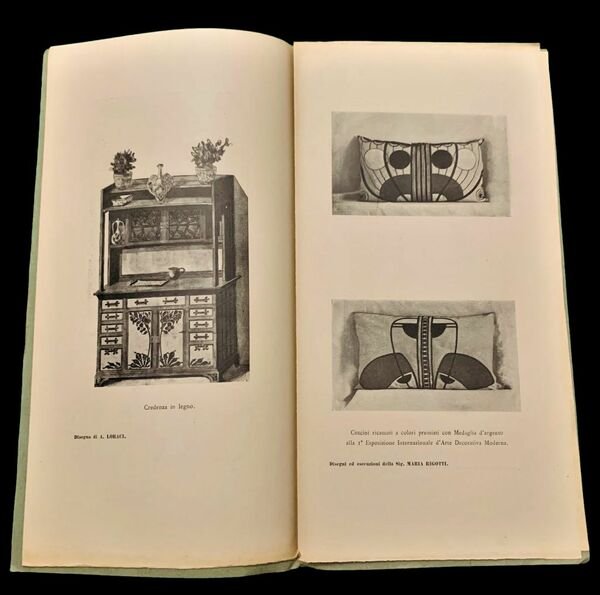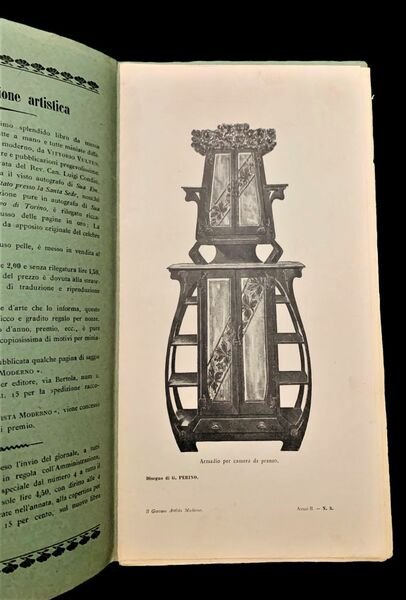In oblungo verticale in 4° grande; 278 pp. per la prima annata e 60 pp. per la seconda annata. Ogni numero presenta la sua brossura editoriale. Rarissima prima annata completa di una delle riviste Liberty italiane più note. La rivista riporta bellissime tavole in monocromia che illustrano l'applicazione del gusto Liberty alle più svariate categorie artistiche e merceologiche come disegni, dipinti, sculture, fregi ornamentali, frontespizi e ornamenti di volumi a stampa, orologi, pendenti, spille, fibbie, lampade, lavori in ferro battuto, mobili, cancelli, arredamenti d'interni, ceramiche, camini, portafogli, cartelli pubblicitari, particolari architettonici, cuscini, portaritratti, tombe e sepolcreti di famiglia, ringhiere, ecc. Questa rivista che in seguito avrebbe preso il nome di L'artista Moderno, rappresentò, all'inizio del novecento, uno dei principali diffusori della cultura Liberty in Italia. Ad essa collaborarono molti artisti fra i quali si possono ricordare Edoardo Rubino, Raimondo D'Aronco, Cesare Ferro, Giacomo Cometti, Frattly Carlo, Liré Agostino, Pizio Oreste, Pietro Vassallo, Vittorio Vulten, Edoardo Cotti, Anton Maria Mucchi, Ferrucio Pesenti, Vacchetta Giovanni e la pittrice Lisa Chiappori, Cesare Giris, ecc. L'idea del giornale era molto ambiziosa e si prefissava di Lanciarsi nell'avvenire. Si legge, dal secondo numero, nell'apertura di apertura posto al recto della brossuraE sorte non meno degna doveva giustamente essere riservata ad un giornaletto come il nostro, che modesto ed inceerto ancora assai nella sua andatura, pure è (pare impossibile!), l'unico giornale italiano, totalmente illustrato di arte moderna. Gli stranieri ci insegnarono, ad umiliazione nostra, a fare grandi e ricchi giornali illustrati di arte moderna, e noi purtroppo, non abbiamo imparato che a pagarli. Ma in questo modo ed a prezzi elevati è impossibile la diffusione fra il grande pubblico, il pubblico dei giovani sopratutto, il quale solo per mezzo di un giornale di poco costo può essere messo in diretto contatto con le nuove produzioni d'arte, le quali tanto più metteranno radice quanto più esteso sarà il campo di conoscenza d'affetti e di confidenza che sapranno accaparrarsi tra di esso. Raro insieme in non comuni condizioni di conservazione.