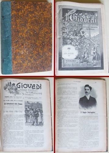 1903 - Annata Completa 1/53. Giornale di avventure per ragazzi con storie di vari autori tra i quali: Luigi Motta, Guglielmo Stocco, Giulio Erpianis, Umberto Cei, ecc. Particolarmente interessante il racconto di Luigi Motta "Il Rajah di Coringa" di raro reperimento in libro. Illustrazioni in b/n n.t. di vari illustratori tra i quali: G. G. Bruno, Attilio Mussino e Emilio. Editore Giulio Speirani & Figli - Torino, 1903. Sulle retrocopertine cataloghi delle opere pubblicate dall'Editore con varie illustrazioni relative alle copertine delle stesse con risalto ai libri di G. Landucci (Salgari) e Motta. Rilegatura coeva con dorso in tela con titolo con copertina originale conservata all'interno. 21x29,5; pp.424. Fascicoli in Ottimo stato. , Molto buono (Very Good)