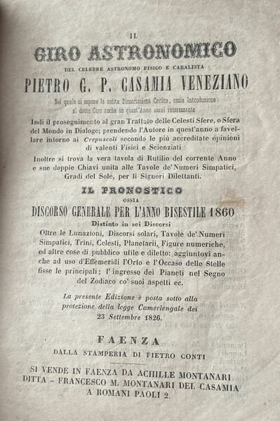 Il giro astronomico del celebre astronomo, fisico e cabalista Pietro G. Casamia veneziano.il pronostico ossia discorso generale per l'anno 1860