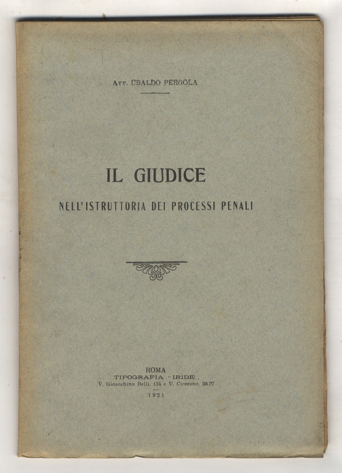 Roma, Tip. "Iride", 1921, in-8, brossura editoriale, pp. 115. Ottime condizioni.