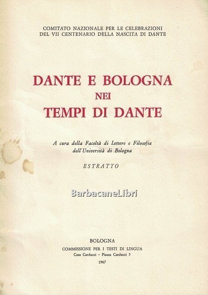 Stato di conservazione: BUONO, copertina leggermente sciupata con alcune macchioline (fioriture) al piatto ant., piccola dedica autografa dell'autore all'angolo della prima pagina di testo, per il resto in ordine. Opuscolo a cura della Facoltà di Lettere e Filosofia dell'Università di Bologna, Commissione per i testi di lingua, Casa Carducci