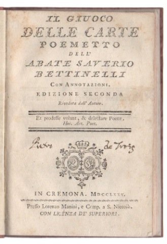 LIBRO Seconda edizione. Leggere fioriture, ma nel complesso esemplare più che buono. Antica firma di possesso al frontespizio. Poemetto giovanile, ma pubblicato da Bettinelli solo nel 1774 durante la sua permanenza a Mantova, «Il giuoco delle carte» è strutturato in 3 canti, ognuno dei quali accompagnato da una sezione di Annotazioni: «Benchè molti sieno i Giuchi delle Carte, qui nondimeno si mira a quelli, che diconsi giuochi di Fortuna, o con adottato vocabolo “d’azzardo”, poichè questi esser ponno argomento di Poema, siccome lo sono di gran vicende, e passioni» (p. 15).