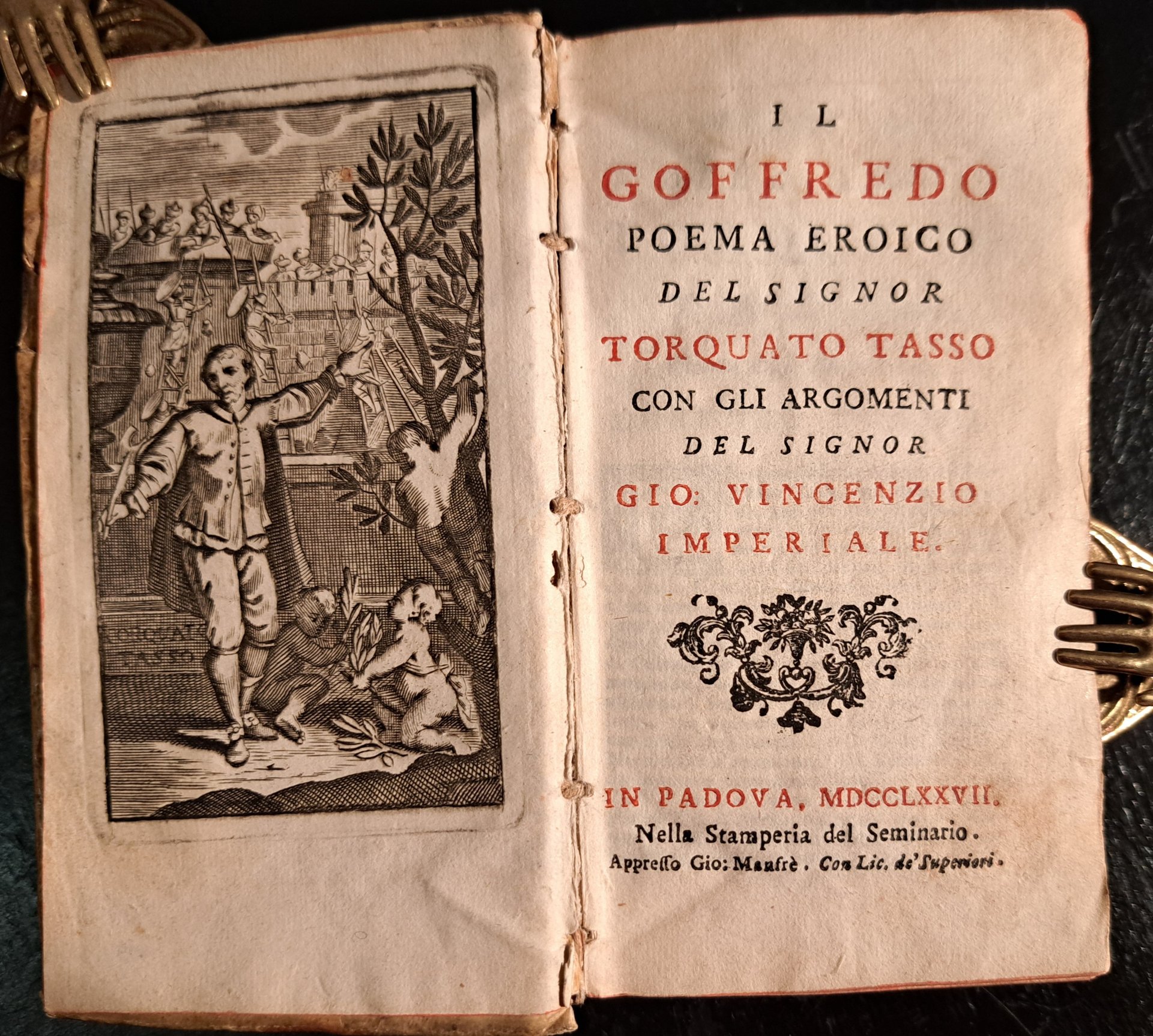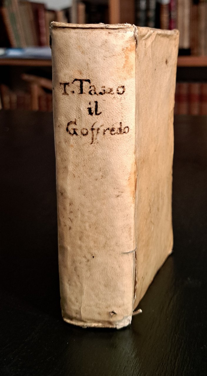 In 12° (cm. 13), pp. 23, 550, cb. Antiporta figurata, frontespizio in rosso e nero. 20 belle tavole f.t. all'inizio di ogni canto. Un errore nella legatura del primo quaderno. Legatura coeva in pergamena (minimo difetto alla cuffia inferiore) Titoli calligrafici al dorso.