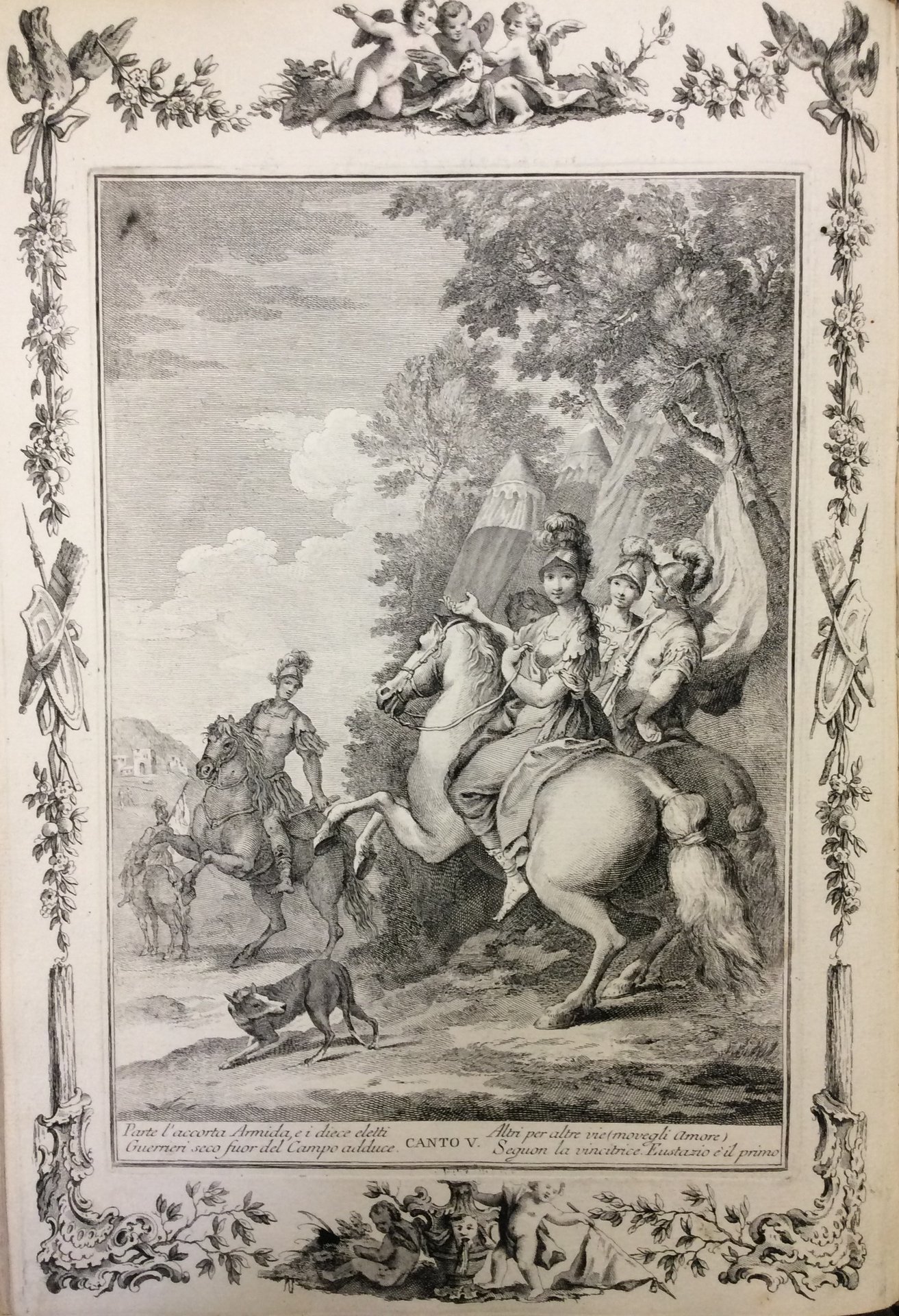 In-folio (mm. 382x258), piena pergamena settecentesca, titolo oro su tassello al dorso, 6 cc.nn., 502 pp. num., 1 c.nn., frontespizio con figura allegorica, inciso in rame dal Rousselet, ornato da pregevoli testate e grandi iniziali figurate pure incise. L'opera è illustrata da 20 tavole incise in rame, all'inizio di ogni canto, con le celebri figure del Piazzetta, tutte inquadrate da un delizioso fregio figurato.<br>La nostra edizione è alquanto singolare. L'opera fu pubblicata infatti senza figure, anche se, come precisano le bibliografie, si trovano esemplari ai quali vennero aggiunte o le figure del Castello o di Antonio Tempesta. Il nostro volume contiene invece tutte le figure del Piazzetta ma non quelle dell'ediz. orig. del 1745 bensì quelle appartenenti a una contraffazione che, come precisa il Gamba, p. 285 "sono facili a riconoscersi perchè in ogni tav. in luogo di dedicazioni sono intagliati due versi della Gerusalemme".<br> Cfr. "La Raccolta tassiana della Bibl. 'A. Mai' di Bergamo",215: "Questa senza dubbio è la più bella e la più nobile edizione che si abbia di questo celebratissimo poema; e ben vi si scorge la maestà e la reale grandezza di chi la fece imprimere. Ella non ha che il solo testo, nè altre figure che un bellissimo frontespizio disegnato dallo Stella, e intagliato dal Rousselet. Ha bensi' parecchi fregi; ed in alquanti esemplari si veggono inserito le figure in grande del Tempesta (Serassi)" - Choix de Olschki,18730 senza le figure - Brunet,V,666: "Belle édition".<br>Bello e fresco esemplare.