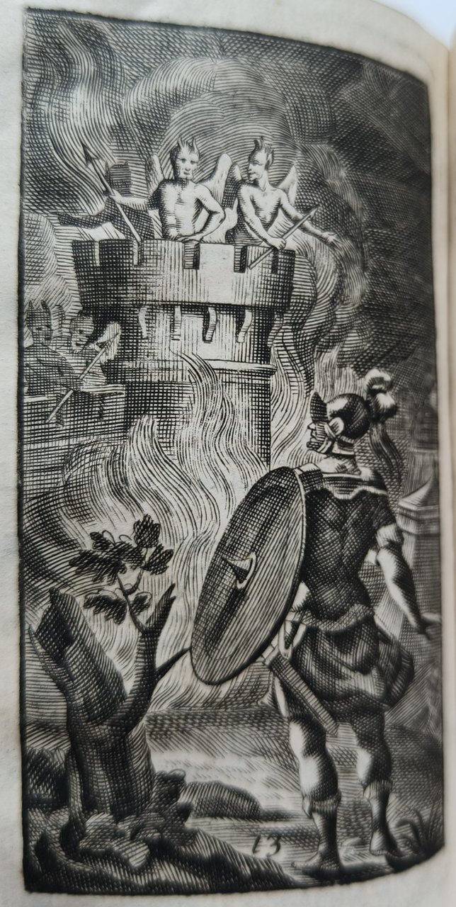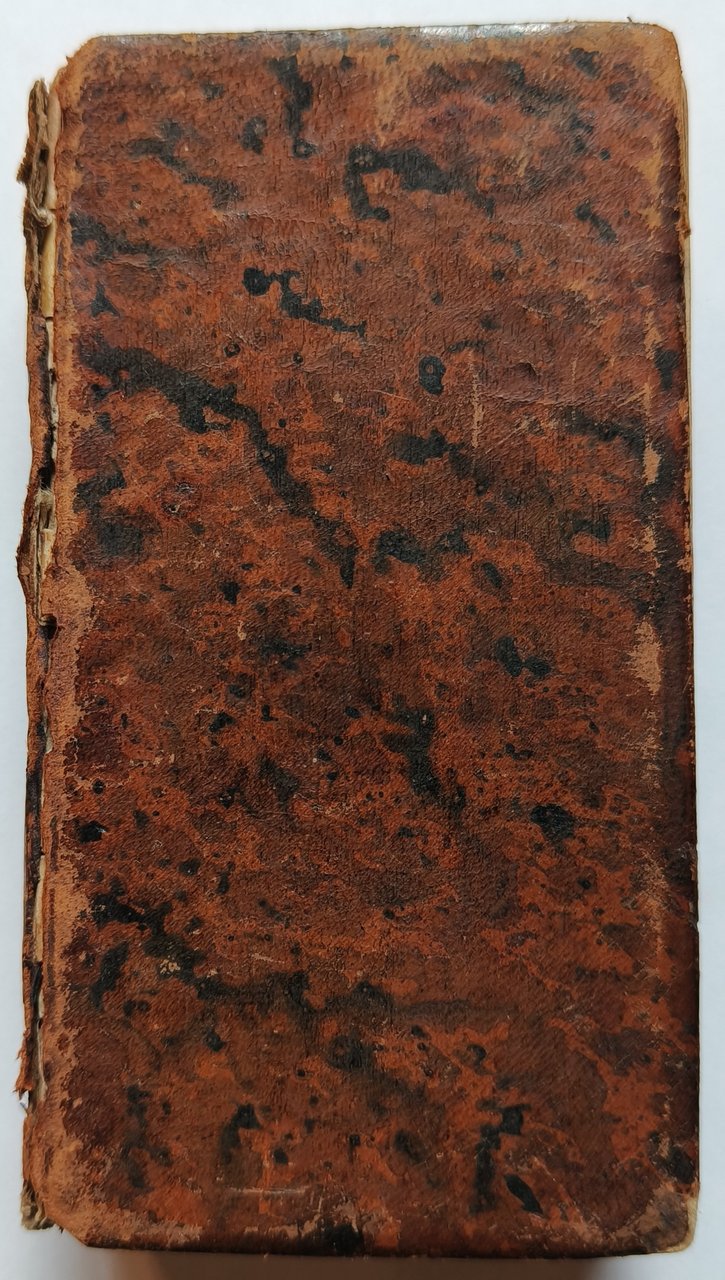 Cm 13,3. Legatura in piena pelle marmorizzata. Dorso liscio capovolto con autore e titolo. Taglio spruzzi rossi. pp (1) 23 (1) 550. Sguardie in carta colorata. Antiporta figurata, 20 figure a piena pagina nel testo poste all'inizio di ciascun canto. Usura e mancanze in copertina, canto secondo leggermente staccato dalla rilegatura.