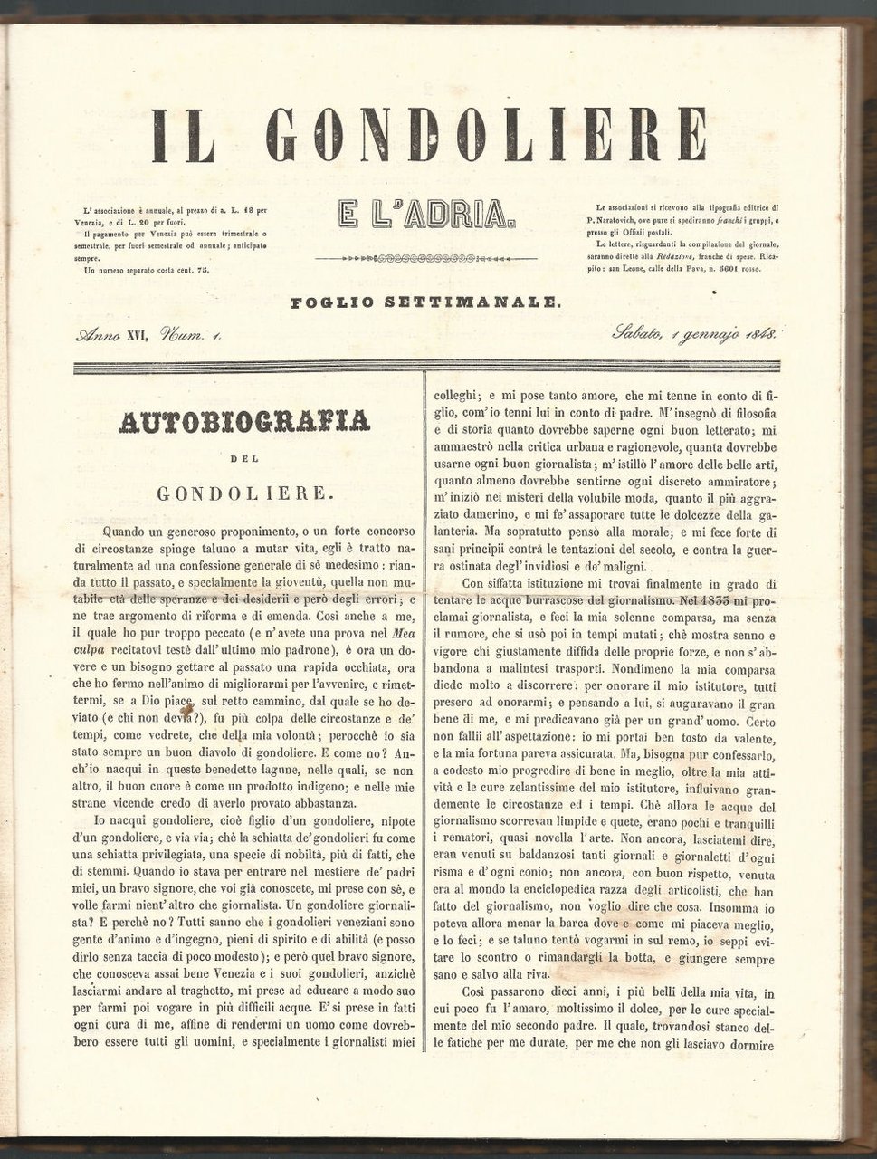 Un volume in 8 rilegato che comprende i fascicoli dal n. 1 (1 gennaio 1848) al n. 12 (18 marzo 1848).
