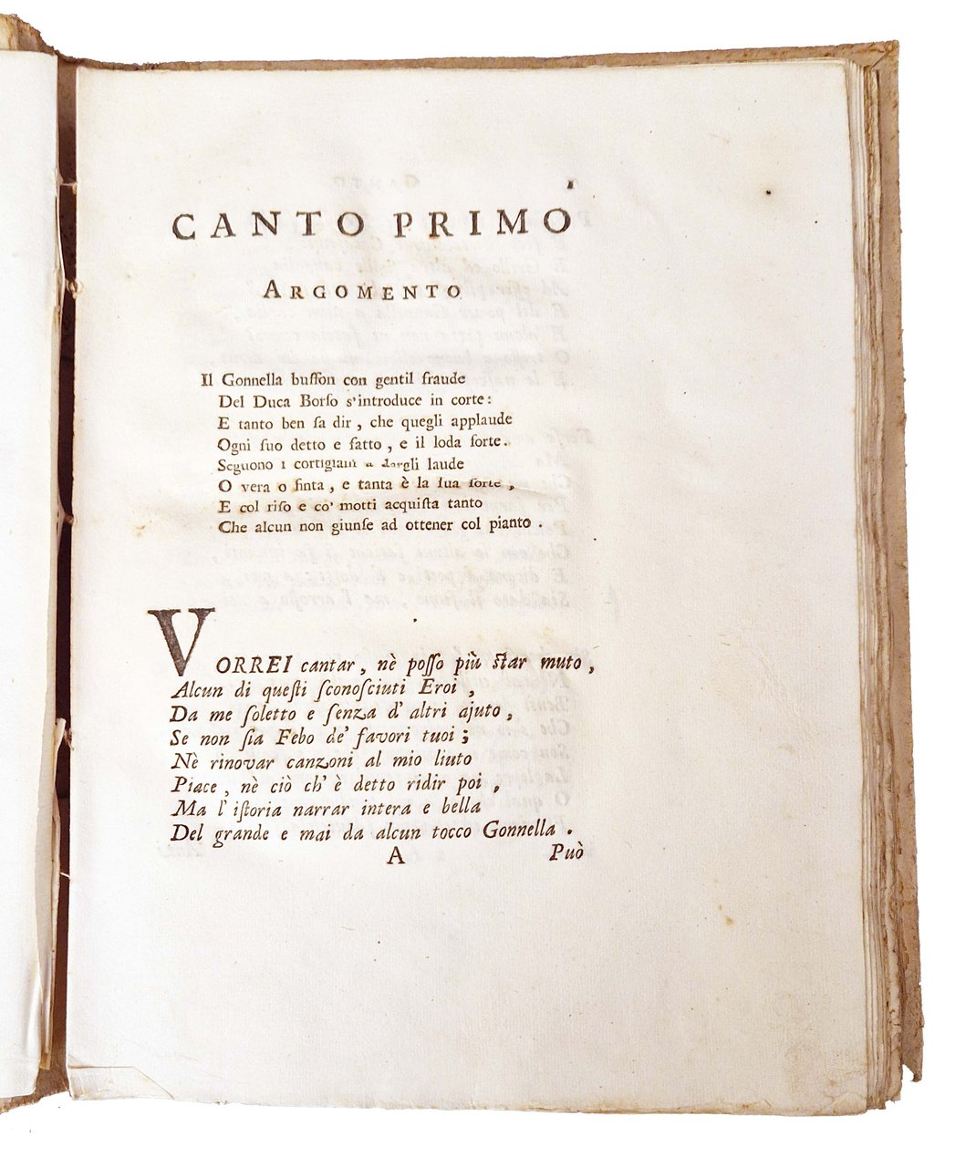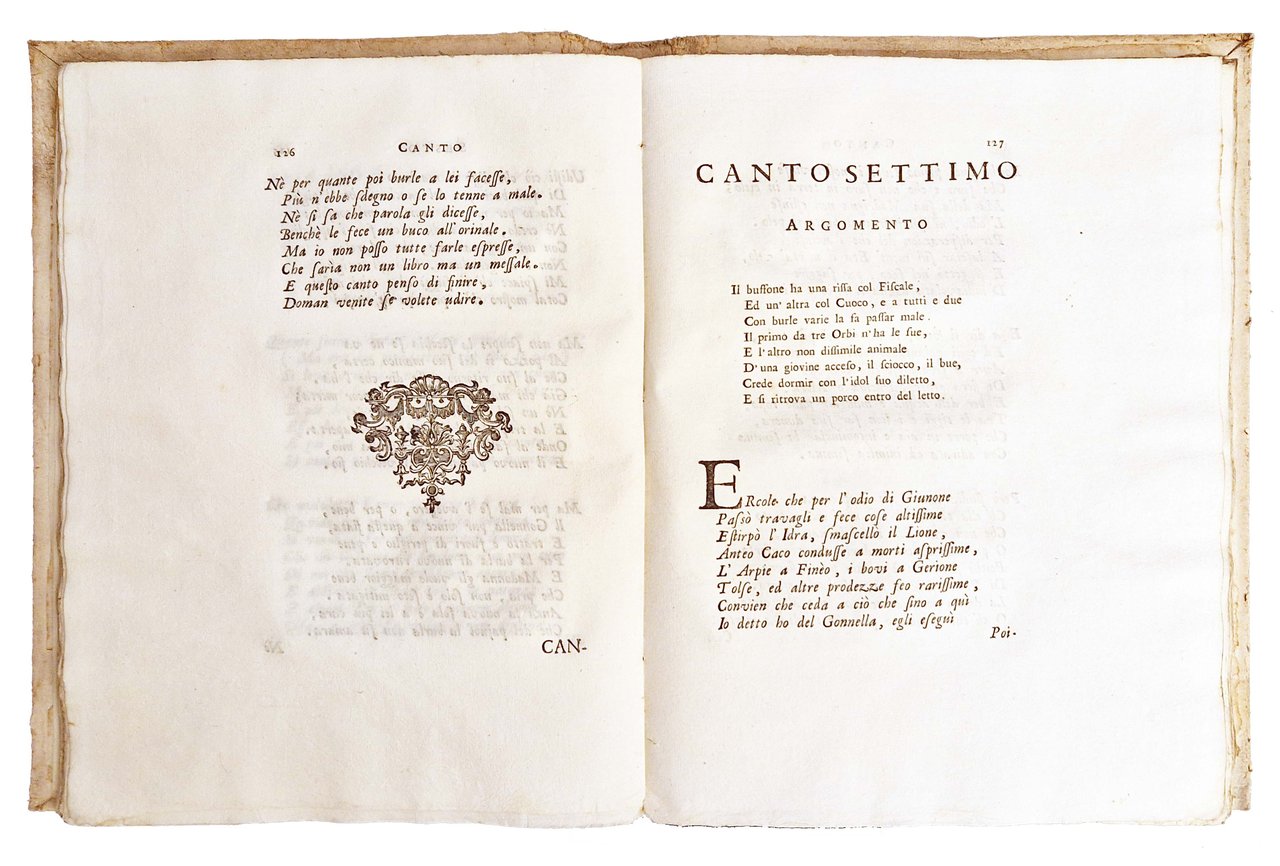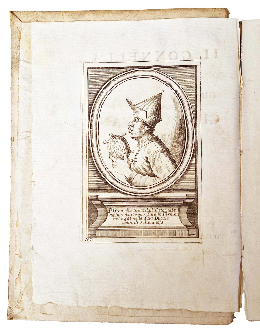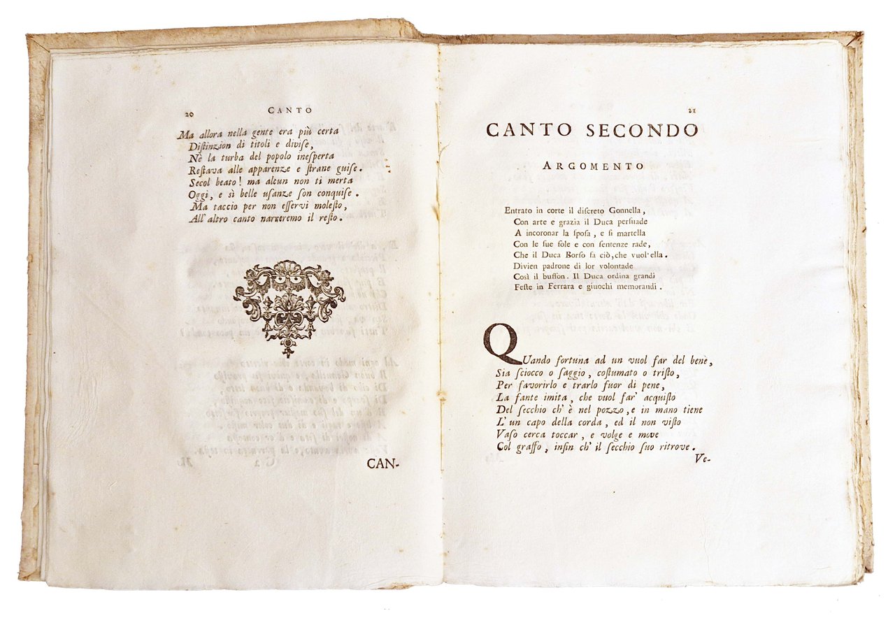 in-4°, 296x224 mm, leg. coeva in cartonato grezzo muto, con titolo manoscritto al dorso; pp. [4], 280, [1] carta di tav.; all'antiporta ritratto calcografico del Gonnella firmato con monogramma M.O. tratto dall'originale dipinto da Cosimo Tura in Ferrara nel 1465 nella sala ducale detta di Schivanoia). Il Gonnella è ritratto con il copricapo a punta, emblema dalla professione di buffone di corte, e la tartaruga fra le mani, emblema della saggezza. Prima e unica edizione del poema giocoso in ottava di Giulio Cesare Becelli, in cui vengono messe in scena in dodici canti le avventure tragicomiche e le grossolane battute del Gonnella, a cura del Beccelli. Pietro Gonnella, o Gonella (Firenze, 1390 circa – Ferrara, 1441), è stato un giullare italiano, buffone presso la corte ferrarese degli Este. Beccelli, Giulio Cesare (1686-1750) scrittore, traduttore, insegnante e tipografo veronese; entrò giovane nella Compagnia di Gesù, ma già nel 1710 ne usciva. Rif.: IT\ICCU\VIAE\008489. OCLC, 1273539357. Cond.: Tracce d'uso alla legatura (bruniture al dorso, macchie ai piatti. Carte forti e pulite, in barbe, con testo molto marginoso. Esemplare molto buono.