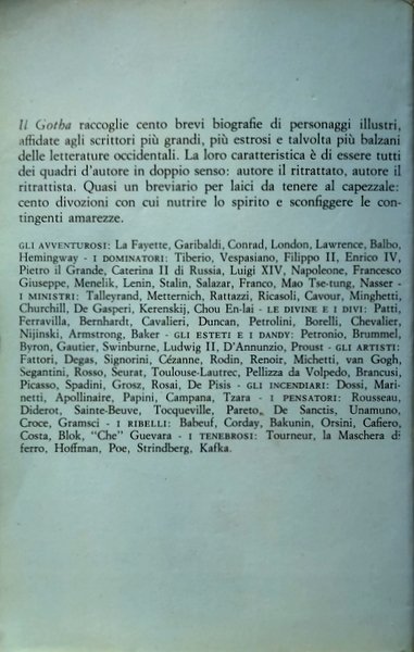 IL GOTHA raccoglie cento brevi biografie di personaggi illustri, affidate agli scrittori più grandi, più estrosi e talvolta più balzani delle letterature occidentali.