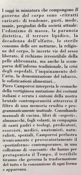 Tendenze, gusti, mode, manie, pregiudizi della società attuale: l'ossessione edonistica, l'edonismo di massa, la paranoia dietetica, il terrore lipidico, la decadenza dell'olfatto, lo sterile consumo delle ore notturne, la religione del corpo, il consumo della notte, le incerte vie del sesso liberato, il richiamo irresistibile della pelle abbronzata, ma anche la scomparsa dell'inferno tradizionale, la crisi degli ospedali, l'inquinamento dell'aria, la demonizzazione del tabacco, le sofisticazioni alimentari. Piero Camporesi interpreta le cronache della vertiginosa mutazione dei costumi italiani e scruta i sintomi della nostra brutale contemporaneità attraverso il filtro di una memoria erudita e programmaticamente inattuale consultando manuali di cucina, libri di "segreti", almanacchi, fogli volanti, in compagnia di santi padri e teologi, predicatori, esorcisti, media.
