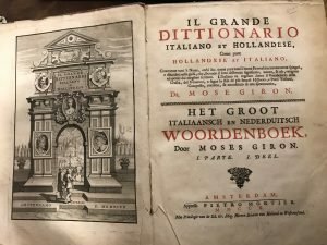 . Contenente tutti li nomi, verbi ecc. come pure tutti li buoni proverbii accuratamente spiegati, e dilucidati nella guisa, che, secondo il loro differente significato, natura, e uso, vengono adoperati dai megliori scrittori. L'italiano va regolato dietro il vocabolario della Crusca, del Veneroni, e segue lo stile de' più famosi Historici, e Poeti Toscani, Composto, corretto, e accresciuto di una Grammatica. Solo 1. Parte italiano olandese, manca il secondo tomo con olandese- italiano. Con un'incisione in antiporta raffigurante una porta con i ritratti di Tasso, Petrarca, Boccaccio e Bembo. Spellature al dorso, prime due carte in parte scucite e con una piega alla parte inferiore dell'attaccatura ( vedi foto), leggera gora al margine esterno delle prime 4 carte, per il resto buono lo stato di conservazione del volume. Pagg. 1080. m. pelle d'epoca con piatti ottocenteschi. Mis mm 265x190