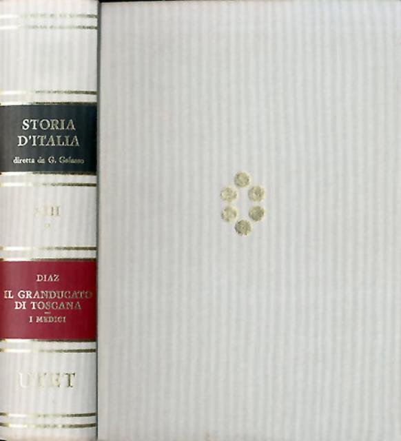 XI, 582 p., [64] p. di tav. : ill. ; 25 x 17 cm. Storia d'Italia, Vol. 13. Tomo 1. Il volume, il 13 (tomo 1) della «Storia d'Italia» diretta da Giuseppe Galasso, è uno dei migliori testi in assoluto prodotti dalla storiografia del Ventesimo secolo sulla storia della famiglia dei Medici in Toscana. La casata dei Medici, qui raccontata magistralmente dal grande storico Furio Diaz, è un'antica e potente famiglia nobile italiana di origine toscana, che divenne una delle dinastie protagoniste e di centrale importanza nella storia d'Italia e d'Europa a partire dal XV secolo e fino al XVIII secolo. Il potere mediceo durò quasi ininterrotto, tranne qualche periodo di breve durata, dal 1434, con la signoria cittadina di Cosimo il Vecchio, fino al 1737 con la morte senza eredi del granduca Gian Gastone de' Medici, ultimo della sua dinastia. Legatura editoriale, coperta in cartone rigido telato di colore grigio chiaro, titolo impresso in oro su tassello al dorso, con fregio in oro al piatto, sovraccoperta in acetato trasparente. 64 tavole fuori testo in b/n e a colori su carta patinata lucida. Codice libreria 8553.