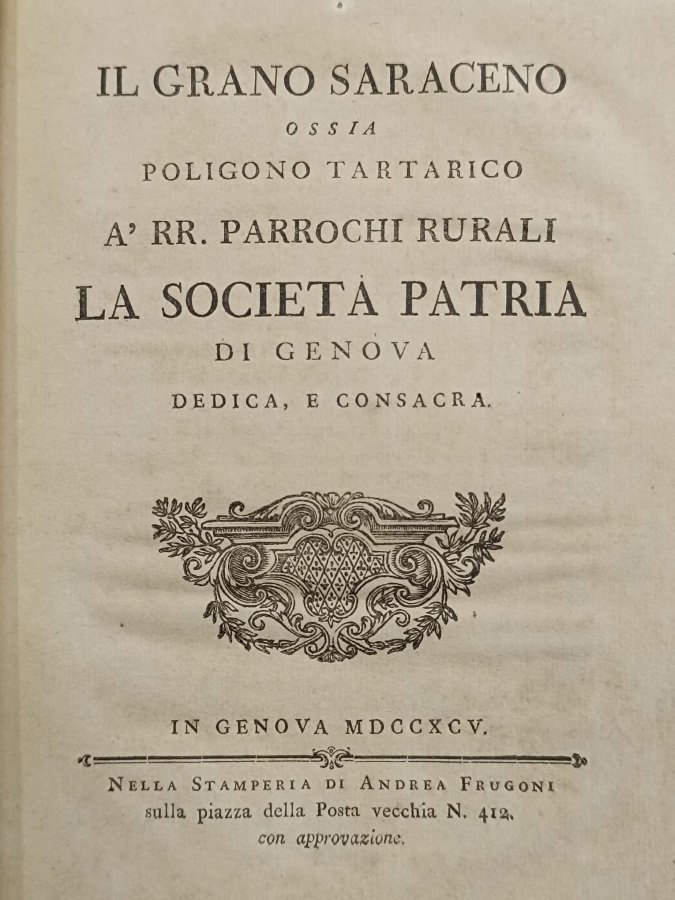 In-4° (cm. 21), brossura muta; pp. 24 in stato molto buono (una brunitura uniforme, piccole note manoscritte al margine superiore). Raro opuscolo dedicato dalla «Società Patria di Genova», su questi «due prodotti esotici utili del pari, e capaci a fecondar nelle terre più ingrate» [p. III]. Fregio silografico al frontespizio ed una elegante testatina sempre in silografia. Esemplare molto buono. (NK6)