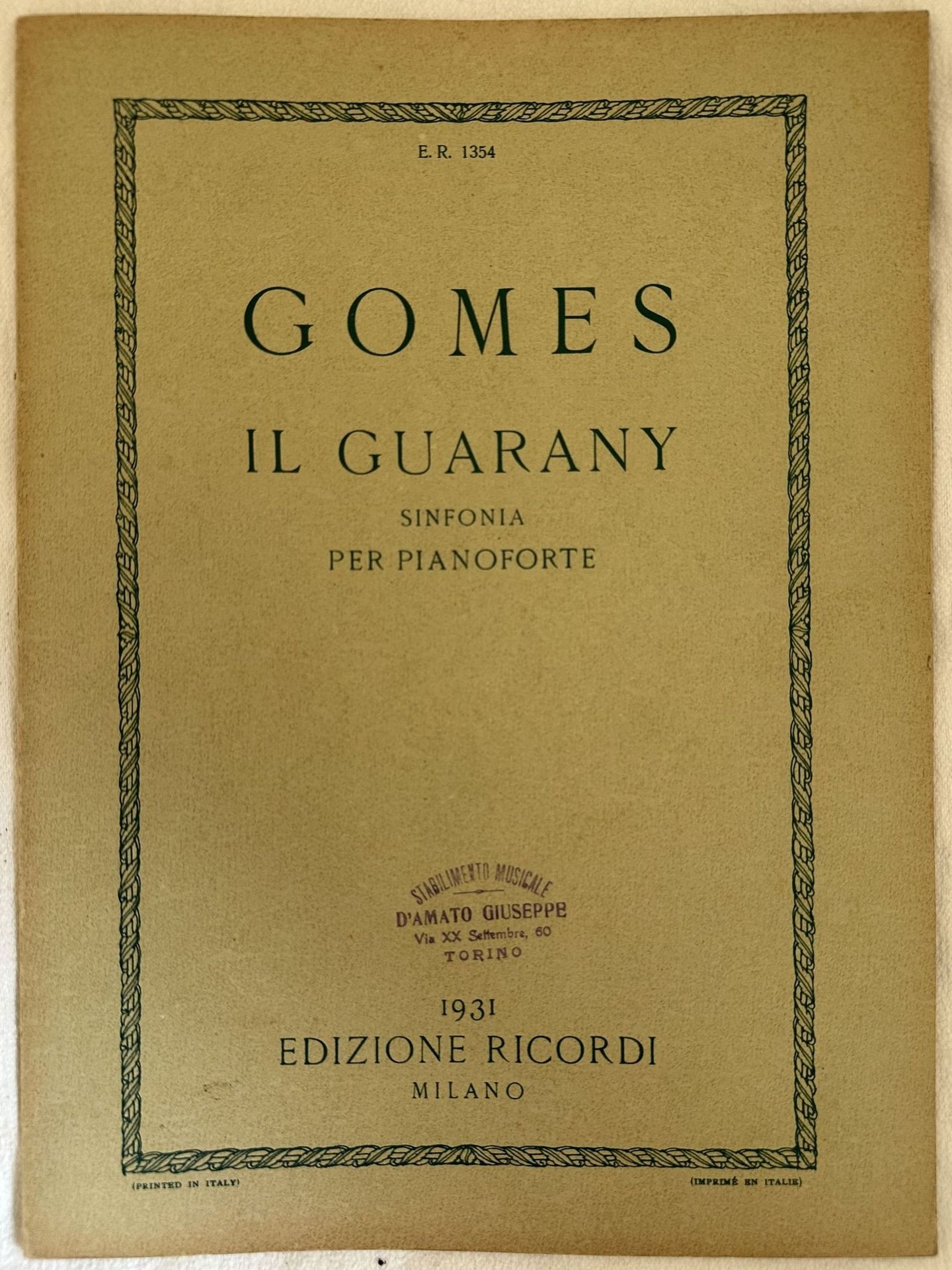 Edizione Ricordi del Gennaio 1932 della melodia "Il Guarany" del compositore brasiliano Antonio Carlo Gomes (1836-1896) . In ottime condizioni. Copertina editoriale in ottime condizioni con lievi usure marginali. Legatura in buone condizioni. Pagine in ottime condizioni con rare fioriture.In folio. cm. 32x23,5. Pp. 12.Ricordi eition of january 1932 of the melody "Il Guarany" by the brasilian composer Antonio Carlo Gomes (1836-1896) . In very good conditions Editorial cover in very good conditions lightly worn in the extremities. Binding in good conditions. Pages in very good conditions with occasional foxing. In folio. cm. 32x23,5. Pp. 12.<BR><BR>