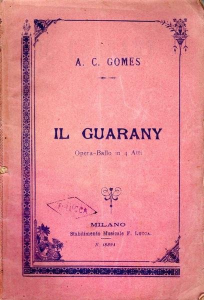 Il Guarany. Opera-Ballo in 4 atti, senza data, pp. 48, formato 14 x 20.<BR>Copertina morbida di colore rosa con titoli in blu al piatto anteriore. <BR>Lievi segni del tempo. Condizioni accettabili.