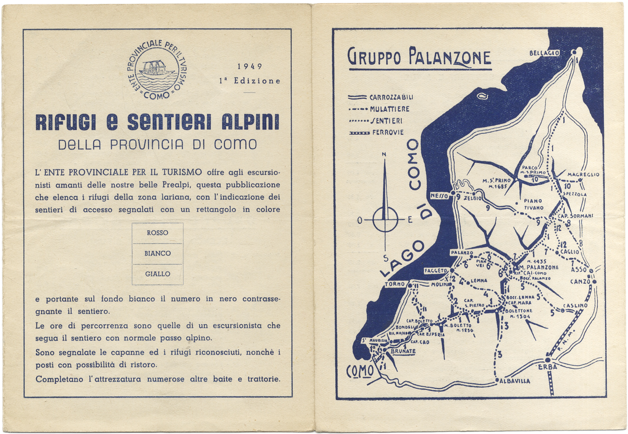 >in-16, pp. (50) di reclame d'epoca anche in bicromia e figurate, VIII, 252, (36 tavole f.t., di cui 2 carte a colori), leg. edit. in tela, titolo in rosso e veduta del lago in b/n applicata al piatto ant. Buon esemplare, arricchitto da un opuscolo in dell'Ente per il turismo di Como che illustra tutti i rifugi della zona lariana.