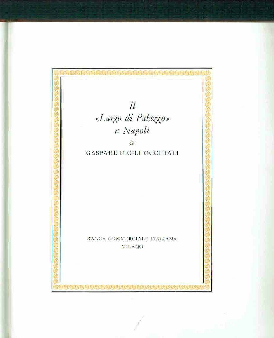 IL �LARGO DI PALAZZO� A NAPOLI. DEGLI OCCHIALI GASPARE. BANCA COMM. ITALIANA, MILANO 1964. PP. 1. 10 TAVOLE IN NERO E 5 A COLORI FUORI TESTO. LEGATURA EDITORIALE IN MEZZA PELLE CON TITOLO IN ORO AL DORSO. CARTA PESANTE DI PREGIO NON RIFILATA. IL VOLUME SUL LARGO DI PALAZZO DI GASPARE VANVITELLI FU EDITO A CURA DI GINO DORIA, IMPRESSO DALLA STAMPERIA VALDONEGA DI VERONA. IN PERFETTE CONDIZIONI RIF. LIBR. ARCHITETTURA LA FOTO CORRISPONDE ALLA REALTA' �