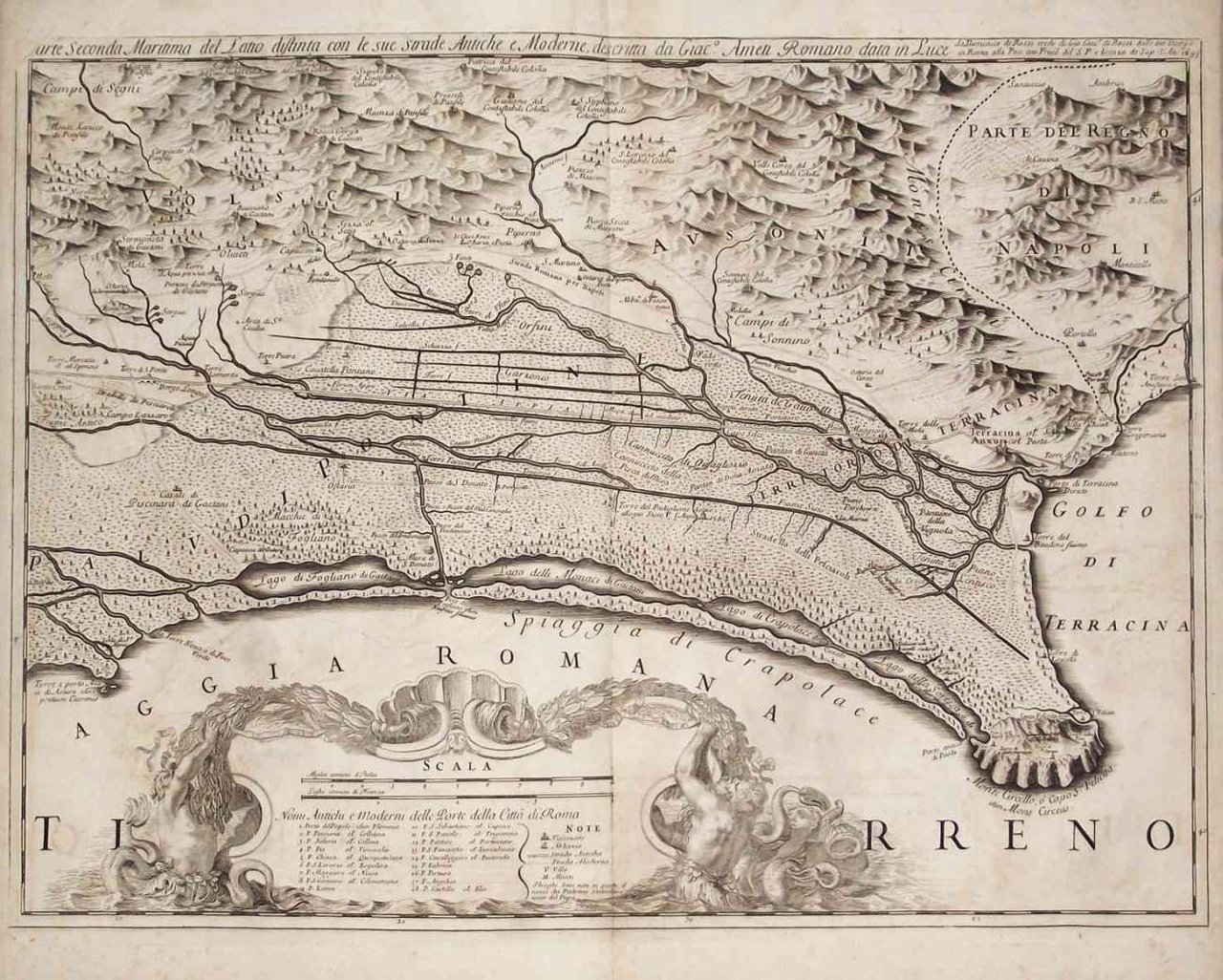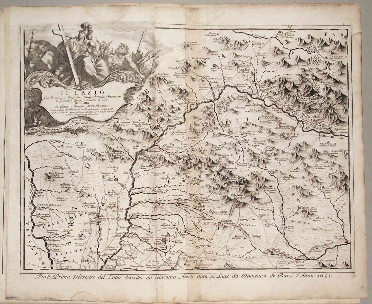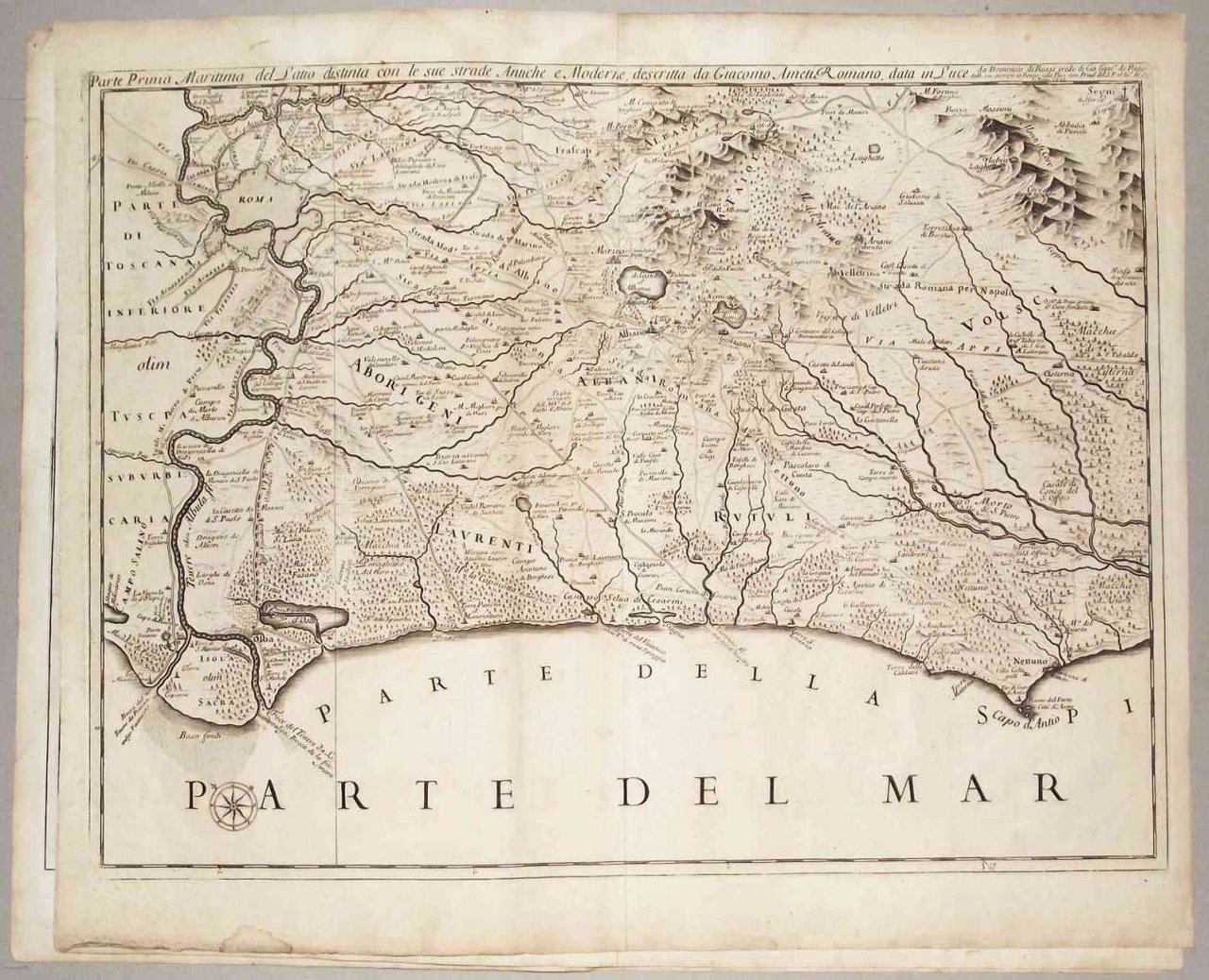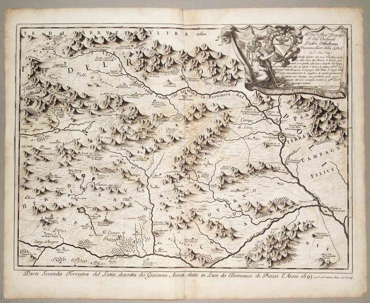 >Incisione in rame su 4 fogli di (cm 43x56):'' Parte prima terrestre'', ''Parte seconda terrestre'',''Parte prima marittima'', ''Parte seconda marittima''. Titolo entro cartiglio con stemma nell'angolo in alto a sinistra, altro cartiglio con stemma nell'angolo in alto a destra, dedica al Cardinale Ottobono. Scala delle miglia e leghe e elenco delle porte della città di Roma, inpressa entro ricca cornice nella parte inferiore destra. Splendida carta topografica incisa su 4 fogli con ampi margini. I 4 fogli uniti formano una grande carta di cm 82 x111. Bell'esemplare, ben conservato di questa rara carta. Bagrow-Skelton. History of Cartography p. 228. Perini, L'Italia e le sue Regioni p. 110