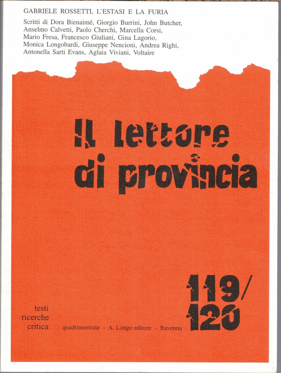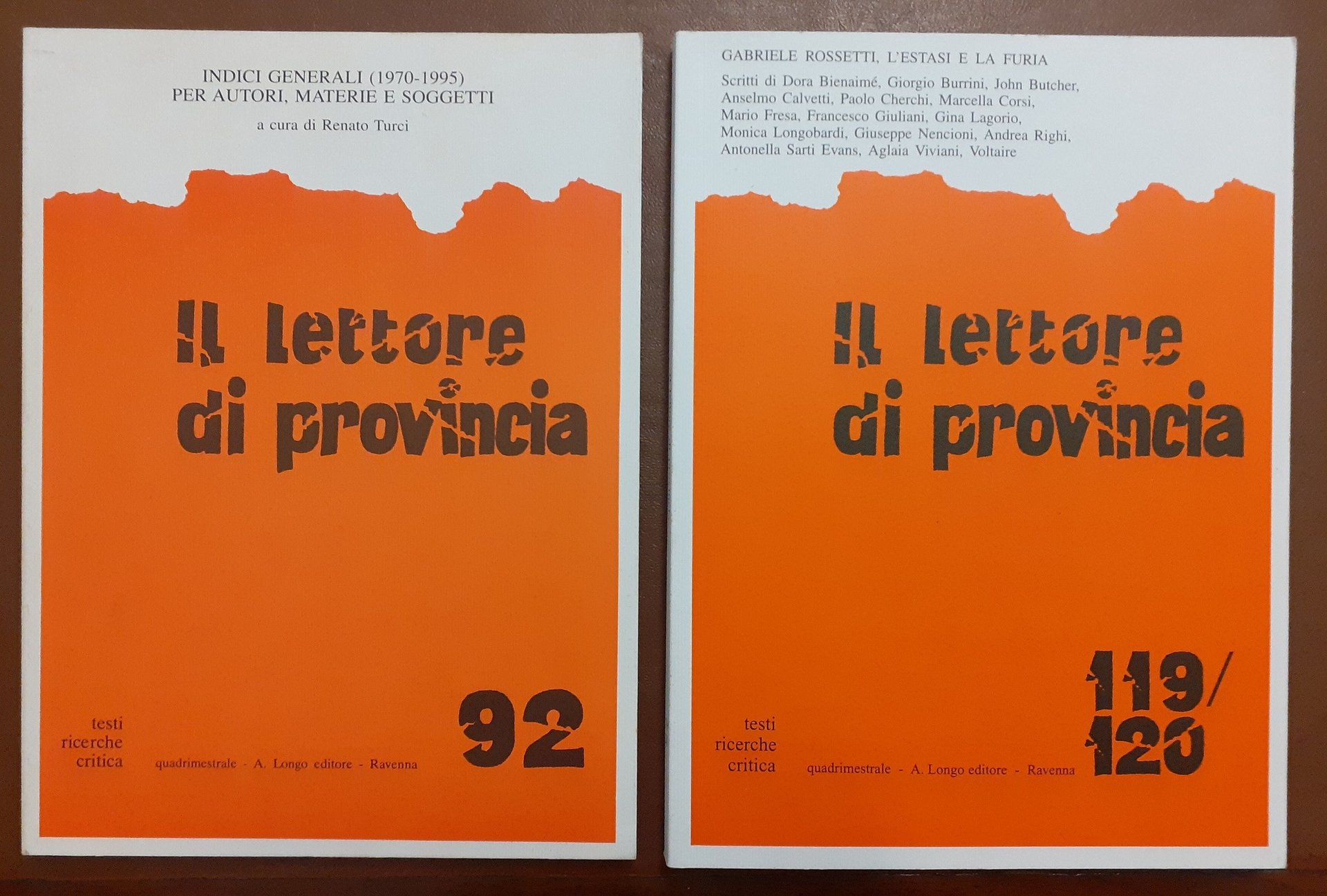 Il lettore di provincia. Rivista quadrimestrale, direttore responsabile Tino Dalla Valle, A. Longo Editore, Ravenna 1995-2004, 2 fascicoli, pp. totali 286, cm 23, br. ed. Il lotto comprende i seguenti 2 numeri della rivista Il lettore di provincia. Rivista quadrimestrale, direttore responsabile Tino Dalla Valle: anno XXVI, fascicolo 92, aprile 1995, pp. 127 – anno XXXV, fascicolo 119/120, gennaio/agosto 2004, pp. 159. Indici. A. XXVI, fasc. 92, aprile 1995: Renato Turci, Il lettore di provincia, dalla nascita (1970) a tutto il 1994 – Legenda a cura di R. Turci – Indice per autori, a cura di R. Turci – Indice per materie, a cura di R. Turci – Indice per soggetti, a cura di R. Turci – Sante Medri, Viaggio nell’editoria romagnola. A. XXXV, fascc. 119/120, gennaio/agosto 2004: Mario Fresa, Gabriele Rossetti, l’estasi e la furia – Giuseppe Nencion, Leopardi e gattopardi. Due scrittori a confronto – Giorgio Burrini,pitture del Piacere. Note e riflessioni in margine alla lettura del Piacere di D’Annunzio – Voltaire, Discours aux Welches (1764). Tradotto e presentato da Dora Bienaimé – Monica Longobardi, Ars Inveniendi: dove trovare gli oggetti introvabili. Contributi da accademie e scuole di Romagna – Marcella Corsi, Il fascino perentorio dei Poems di Katherine Mansfield – Aglaia Viviani, When ald Queen Bess come to dine. La figurazione di Elizabeth I nell’opera di Virginia Woolf – Andrea Righi, La forma della contraddizione sociale in un racconto di Grace Paley – Antonella sarti Evans, Mike Johnson: la maledizione di Lear – John Butcher, A proposito dell’esordio letterario di Domenico Rea – Anselmo Calvetti, Divinità silenziose e crisi solari – Francesco Giuliani, Il dogma, la modernità e Leopardi. Lettura di due libri di Franco Cassano – Gina Lagorio, Il calcio a Cherasco – Paolo Cherchi, Il signore degli occhi di Roberto Pazzi. Minime fioriture ai tagli di entrambi i fascicoli, al fasc. 92 talloncino in carta applicato al frontespizio verosimilmente a copertura di un timbro e piccola mancanza al margine di una carta, ma senza perdite di testo, per il resto fascicolo in ottimo stato di conservazione. Perfetto, salvo minime fioriture, il fasc. 119/120.