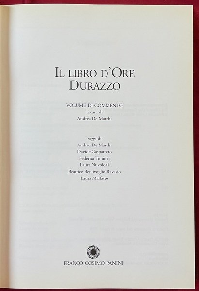 Commentario al facsimile: Il libro d’ore Durazzo. A cura di A. De marchi, saggi di B. Bentivoglio-Ravasio, A. De Marchi, D. Gasparotto, L. Malfatto, L. Nuvoloni e F. Toniolo. Legatura in velluto editoriale con impressioni in oro sui piatti e dorso. Numerose illustrazioni a colori. Formato : 15,5x21,5 cm. Pagine : 335. Peso : 0,735 kg. Condizioni ottime.